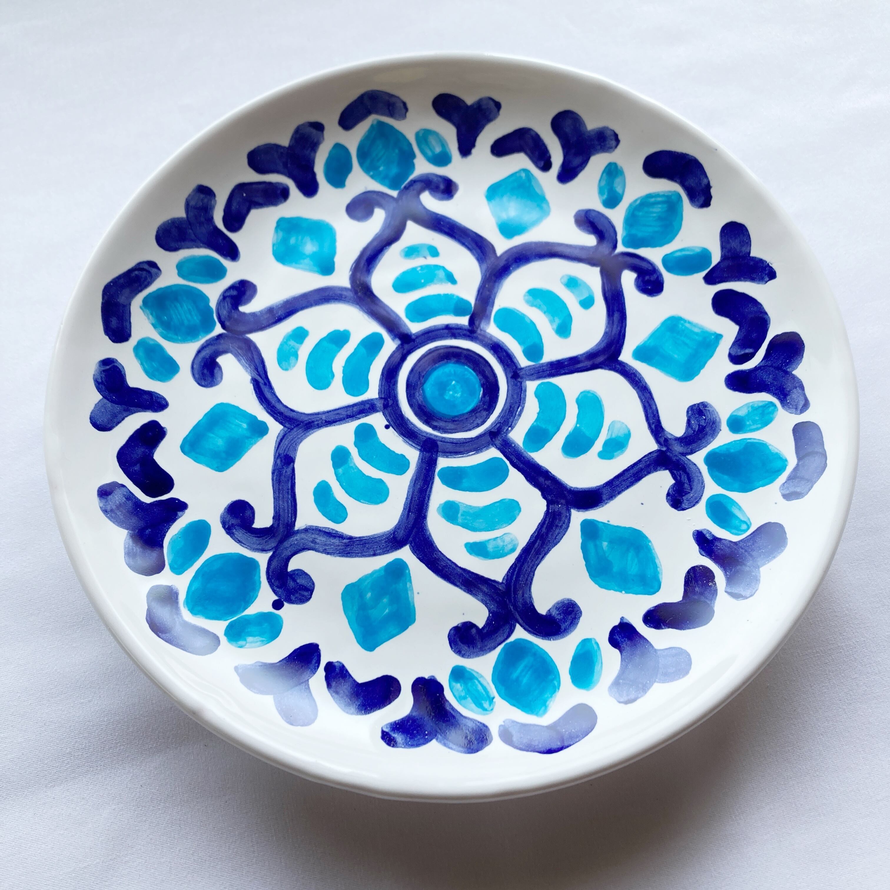 素焼きに不透明の白い釉薬を掛け、その上から手描きで絵付けし約1000度で燃焼します。