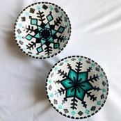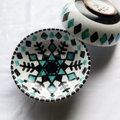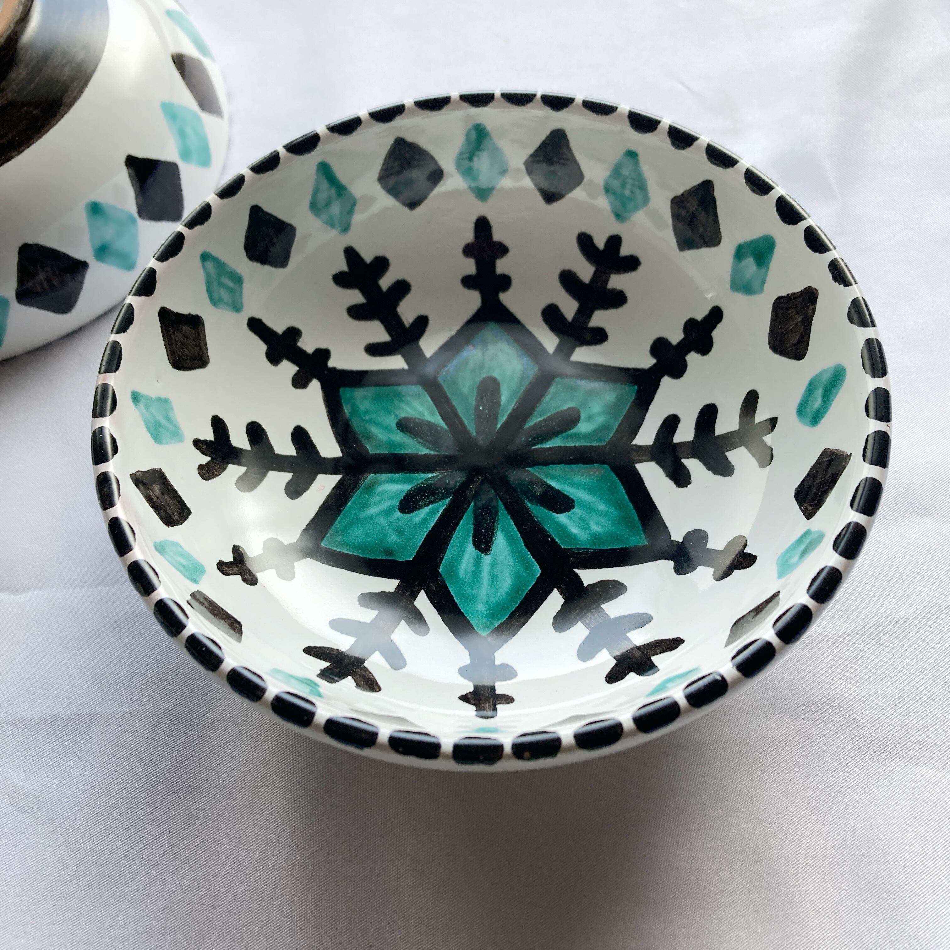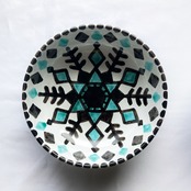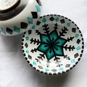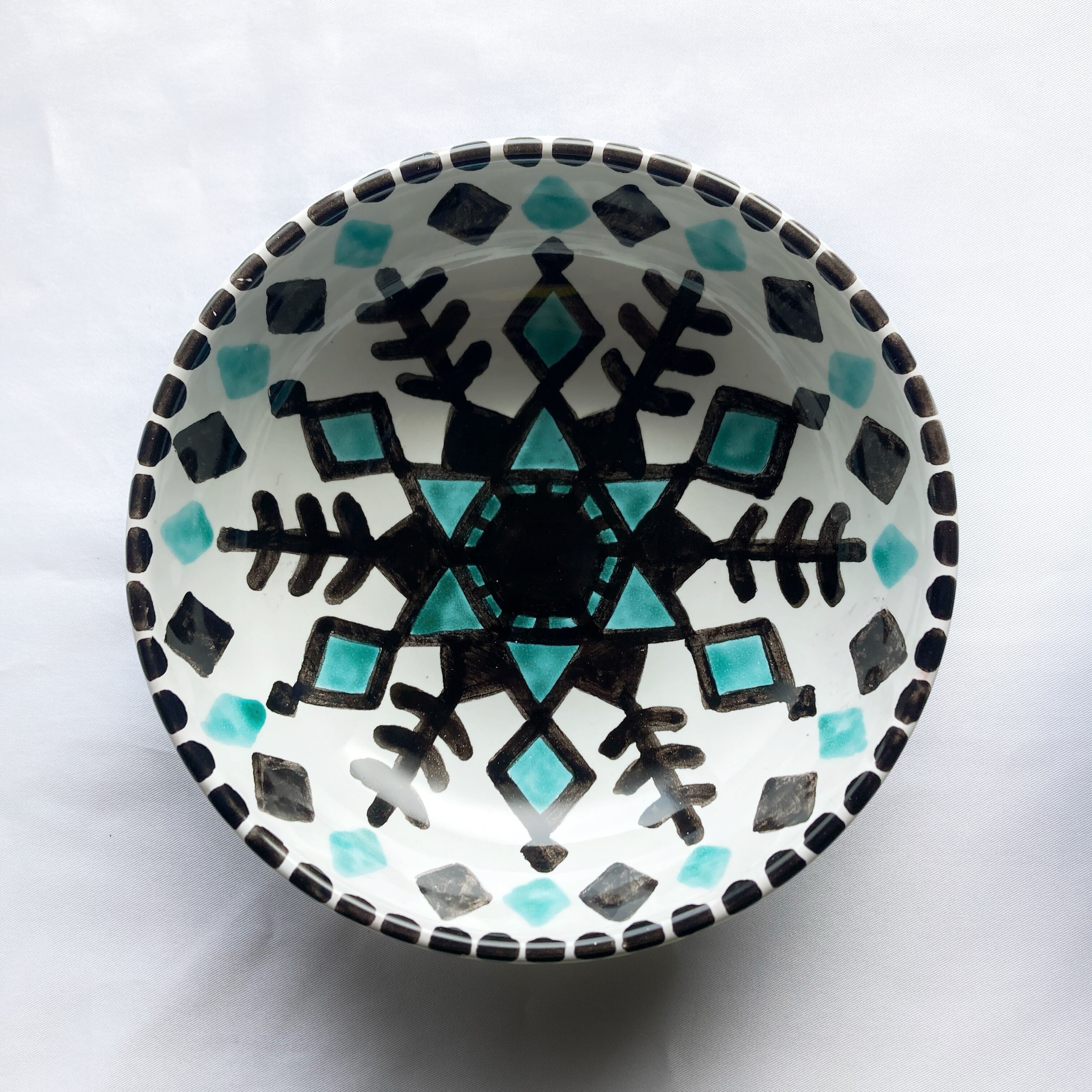 雪の結晶のような幾何学模様を黒褐色とグリーンで描きました。