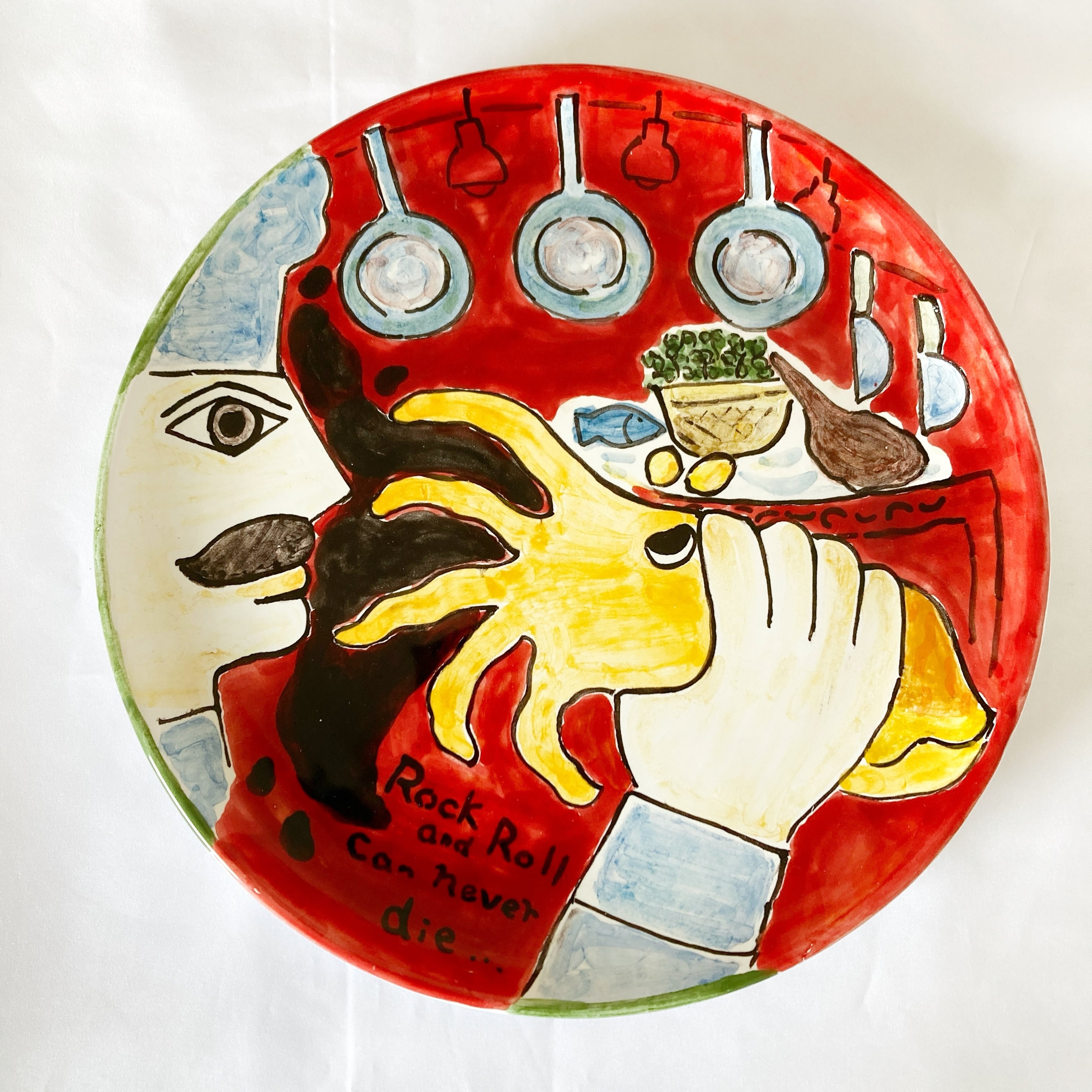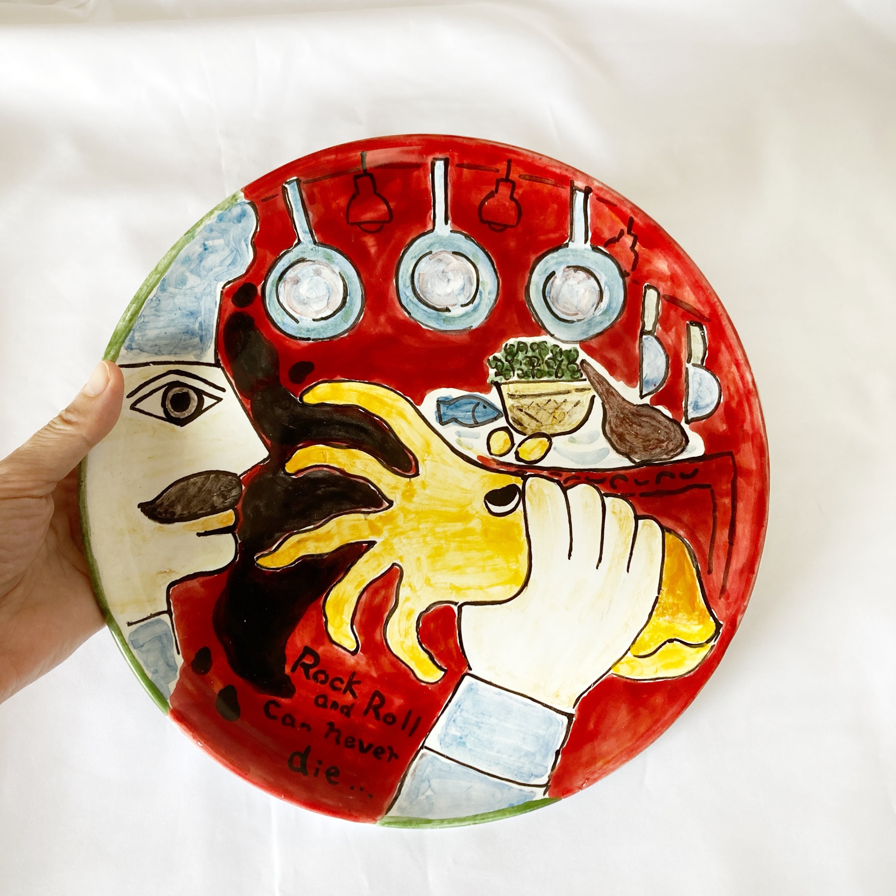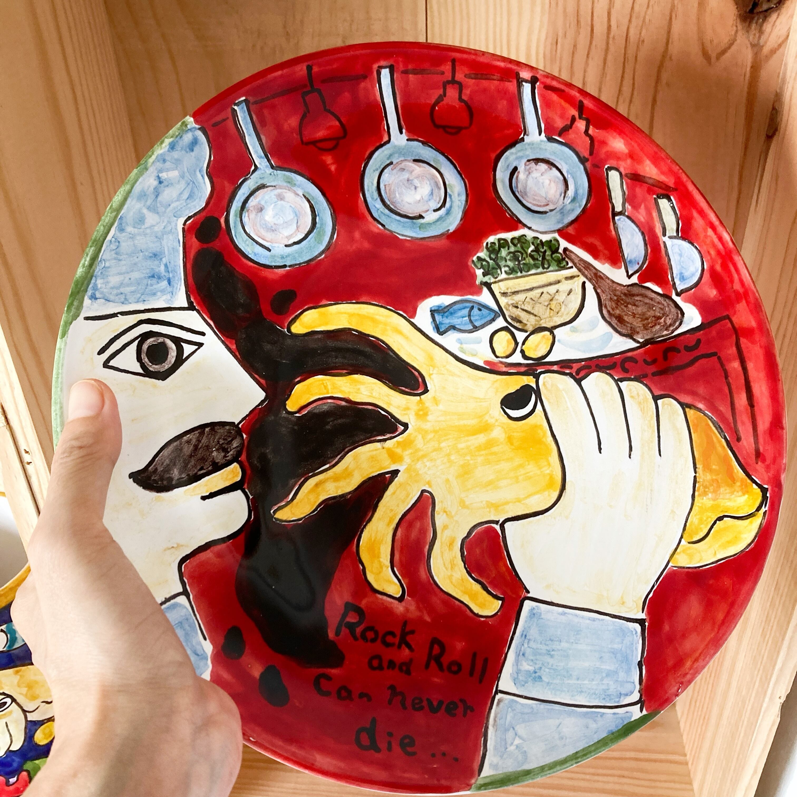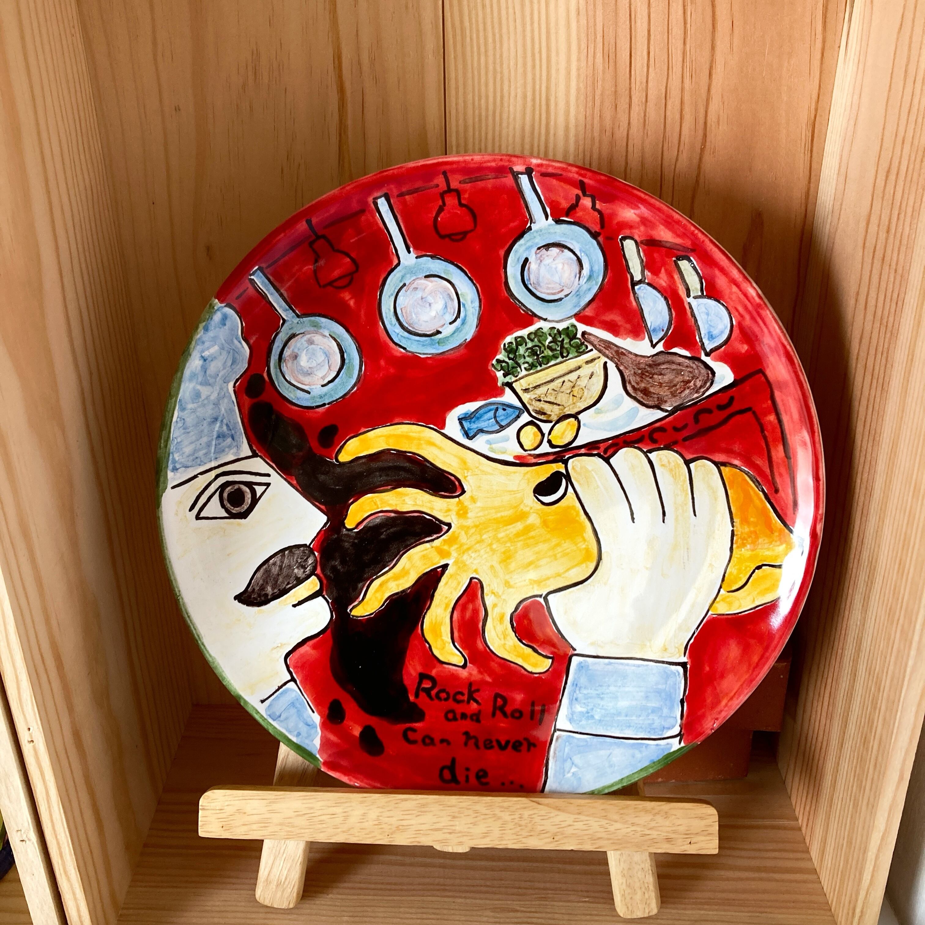 コウイカとイタリアンシェフのモチーフの絵皿です。高台に壁掛け用の穴が空いています。