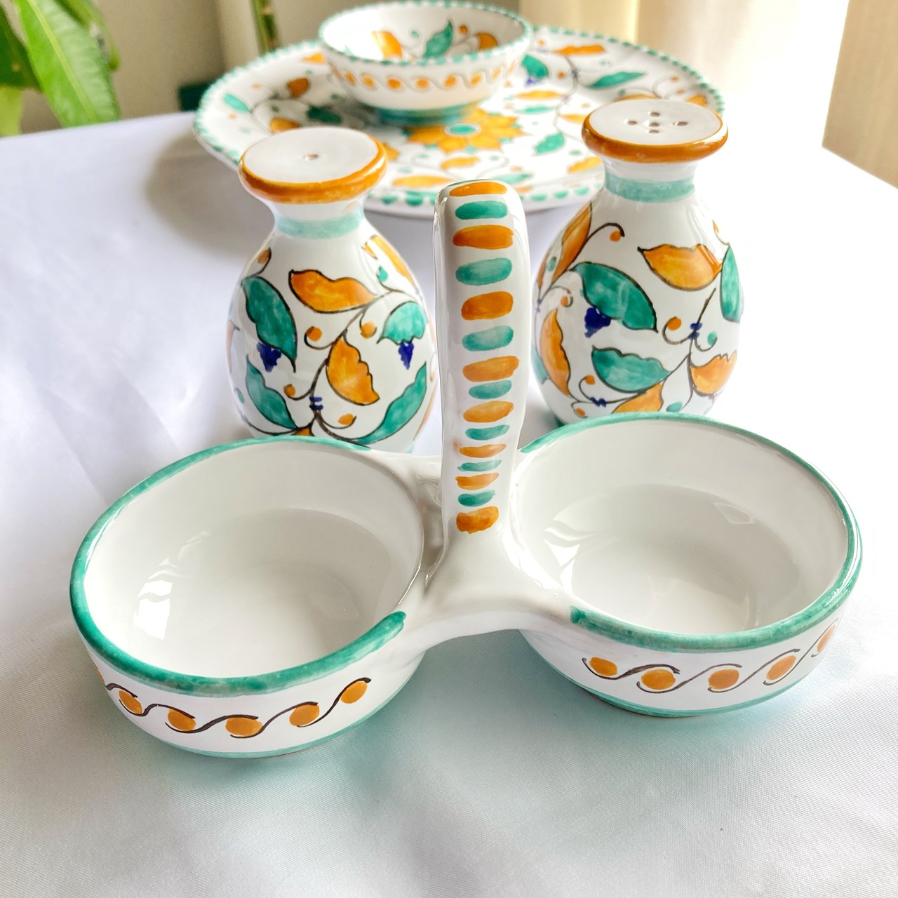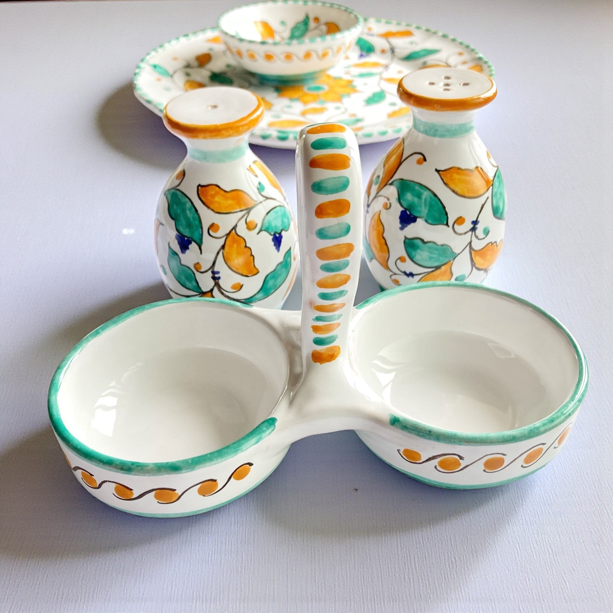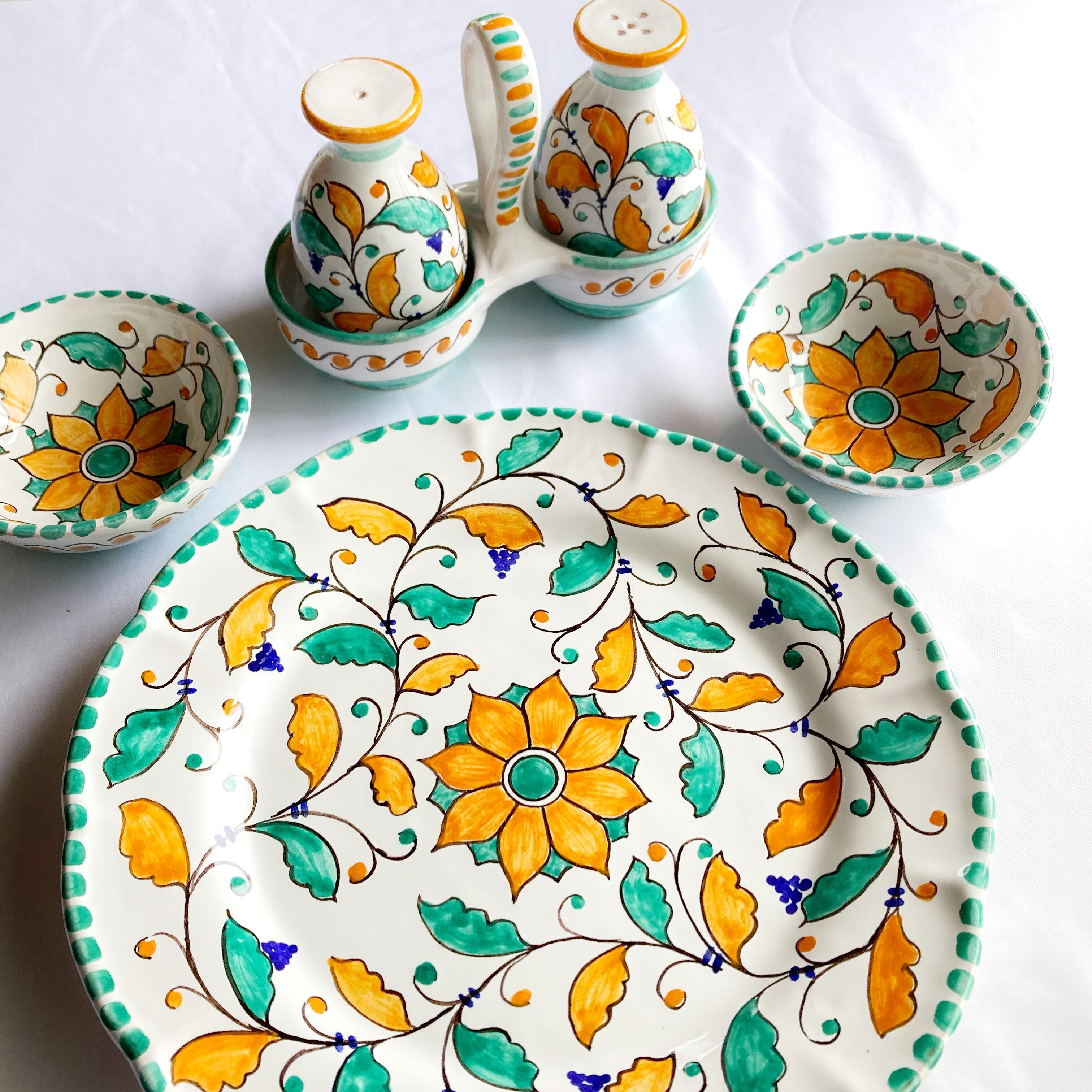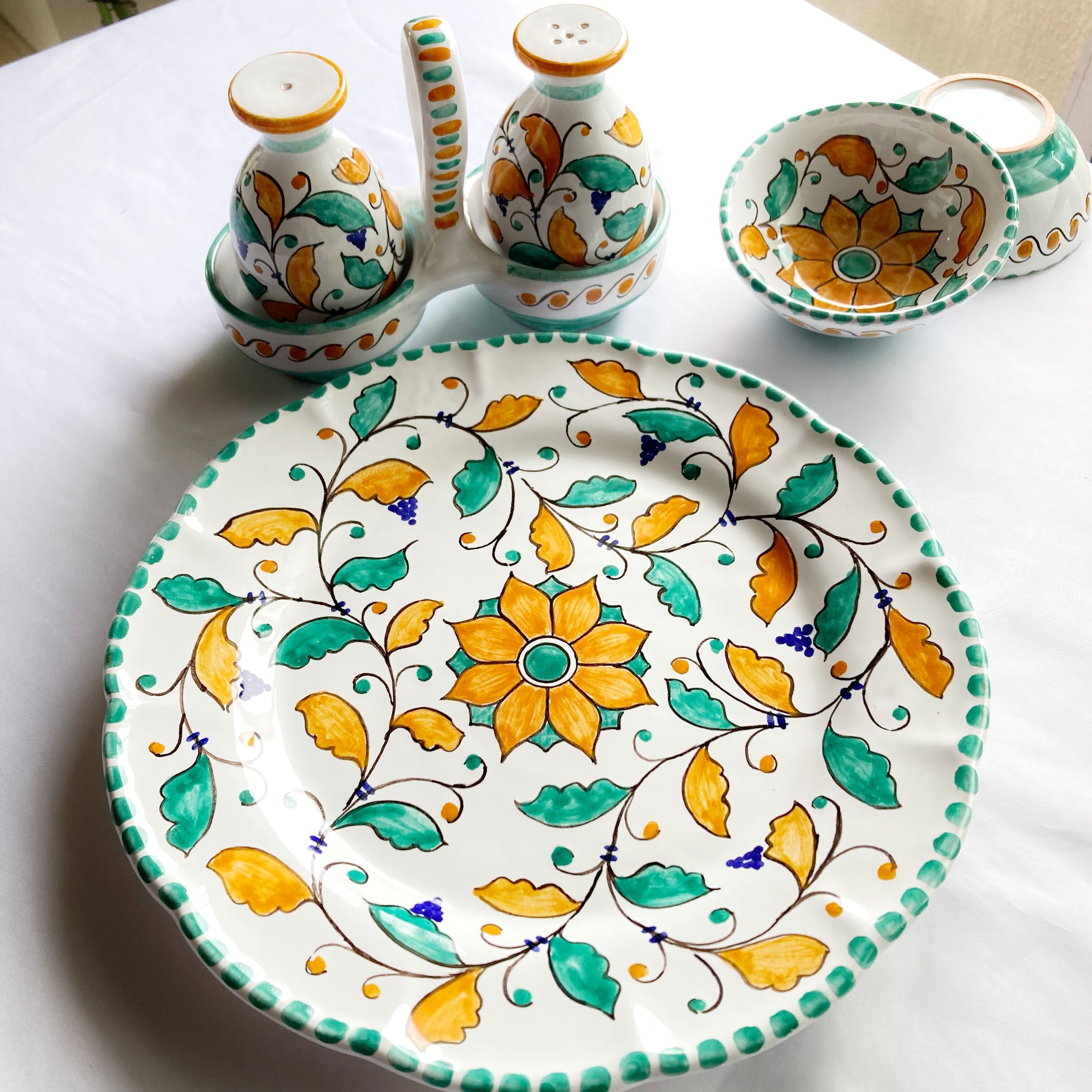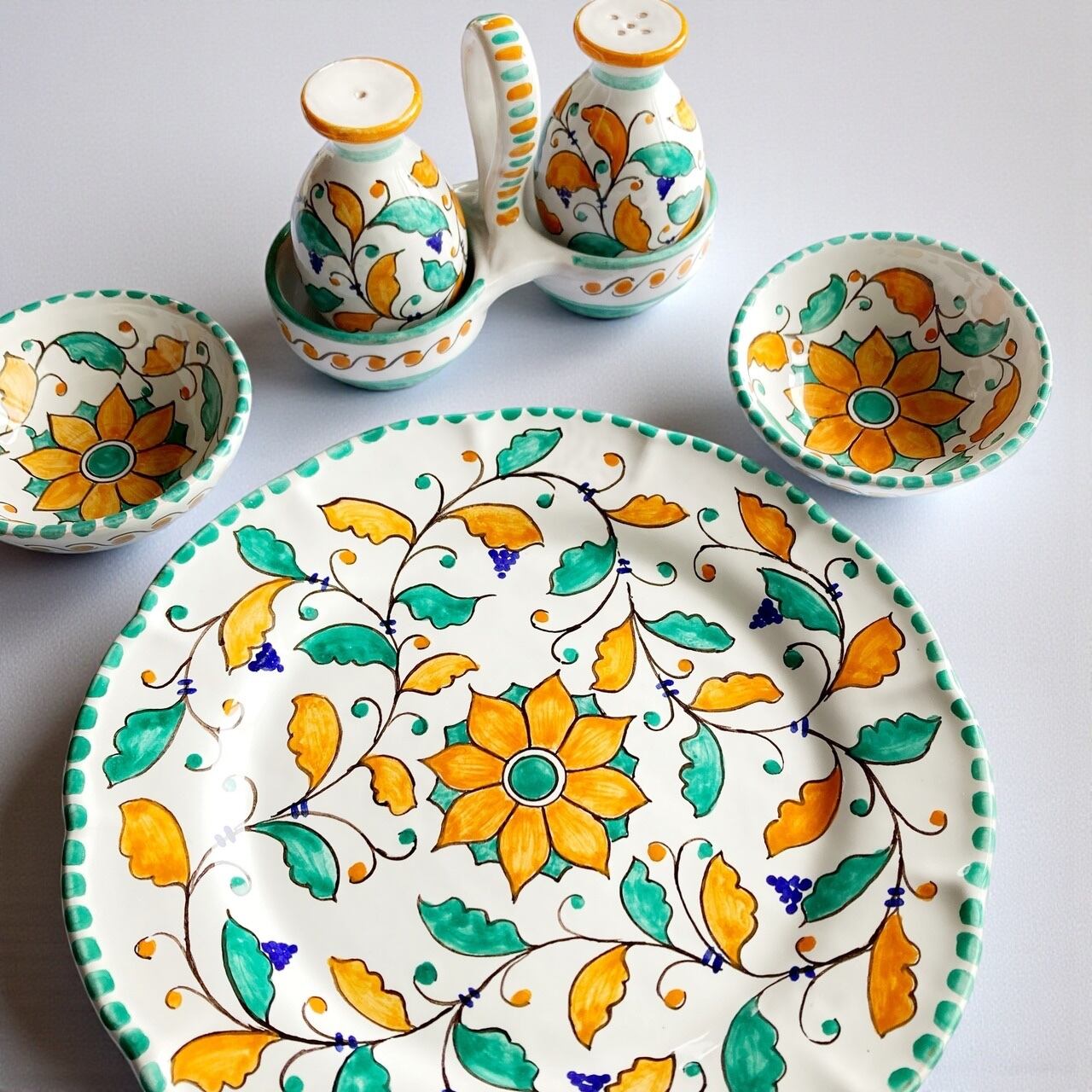 マヨリカ焼きの伝統色グリーンとオレンジで描いた植物柄。置いていくだけで食卓が華やかになります。