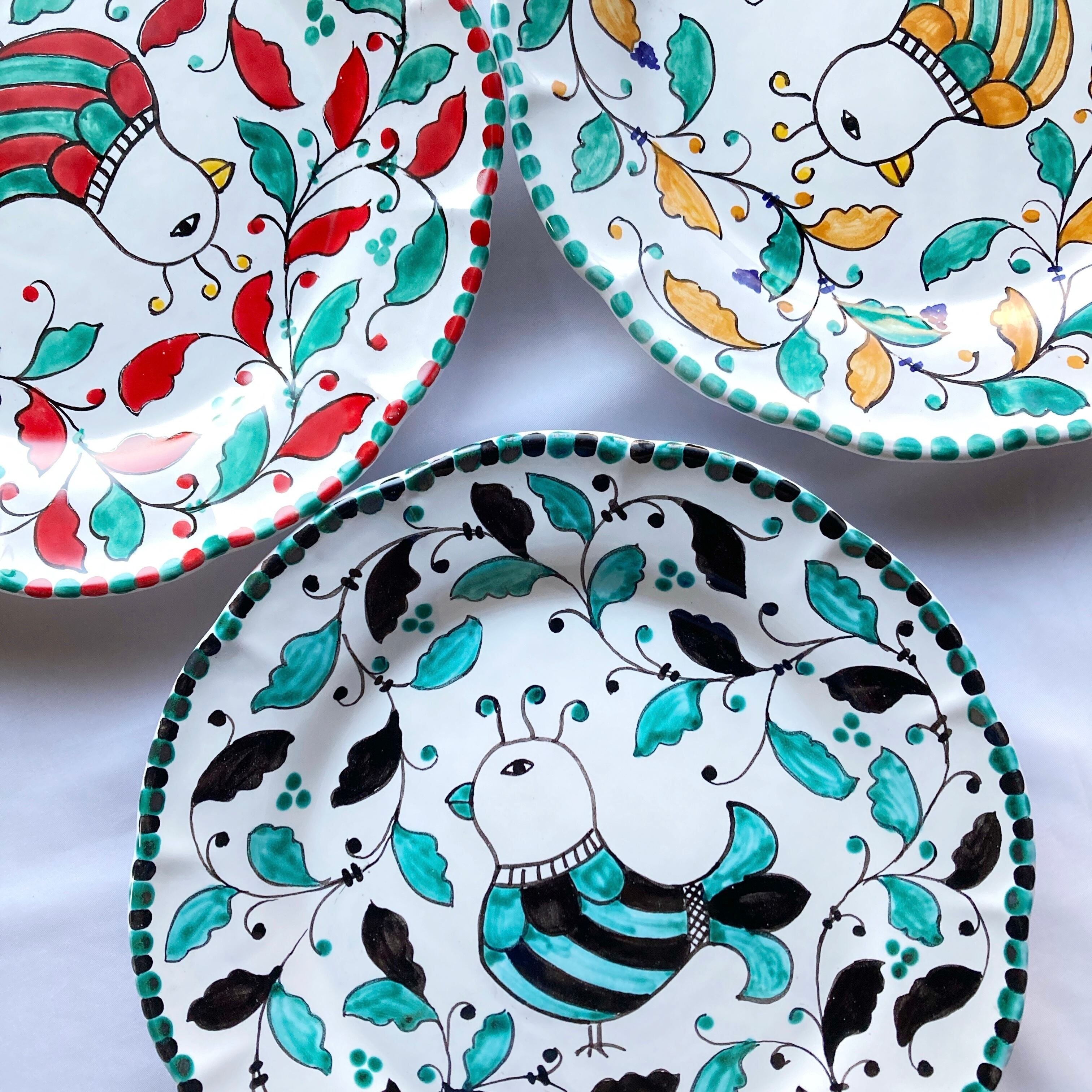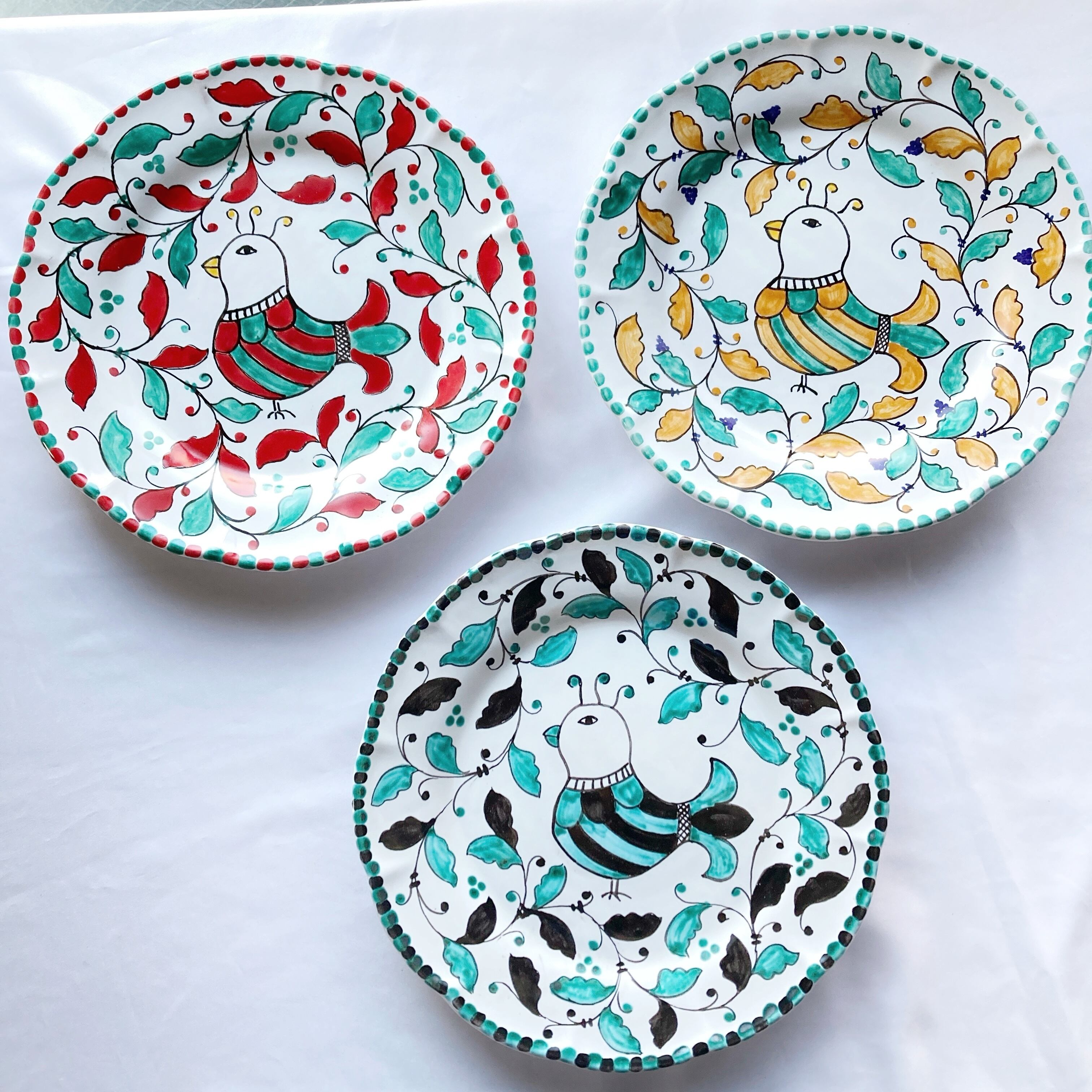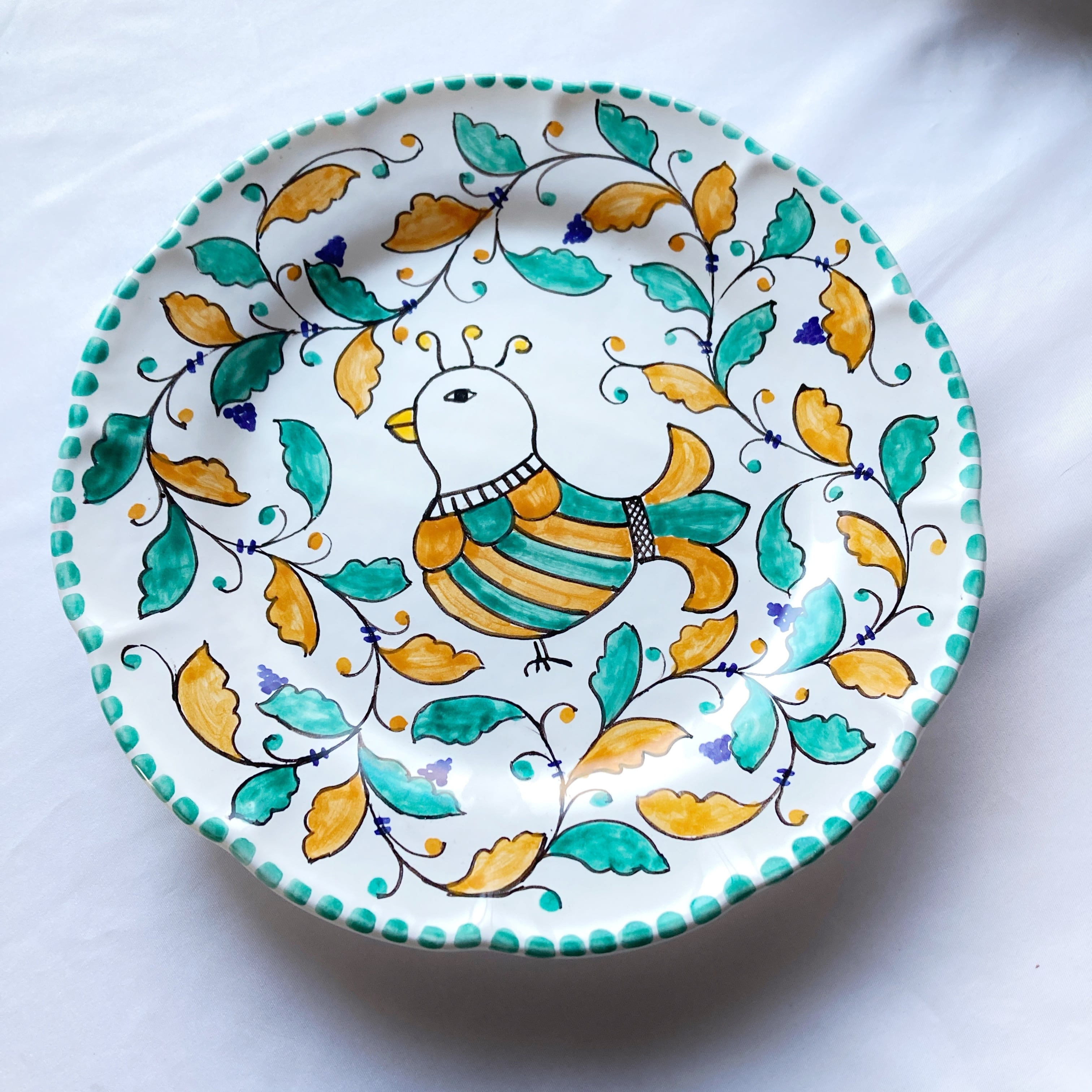 マヨリカ焼きの伝統色グリーンとオレンジの色彩で描いた高貴な鳥と植物模様のディナー皿。