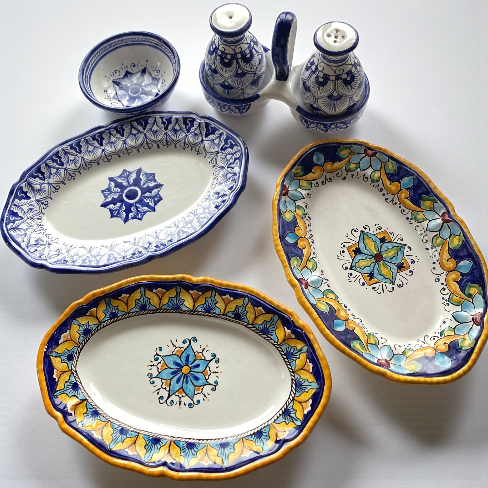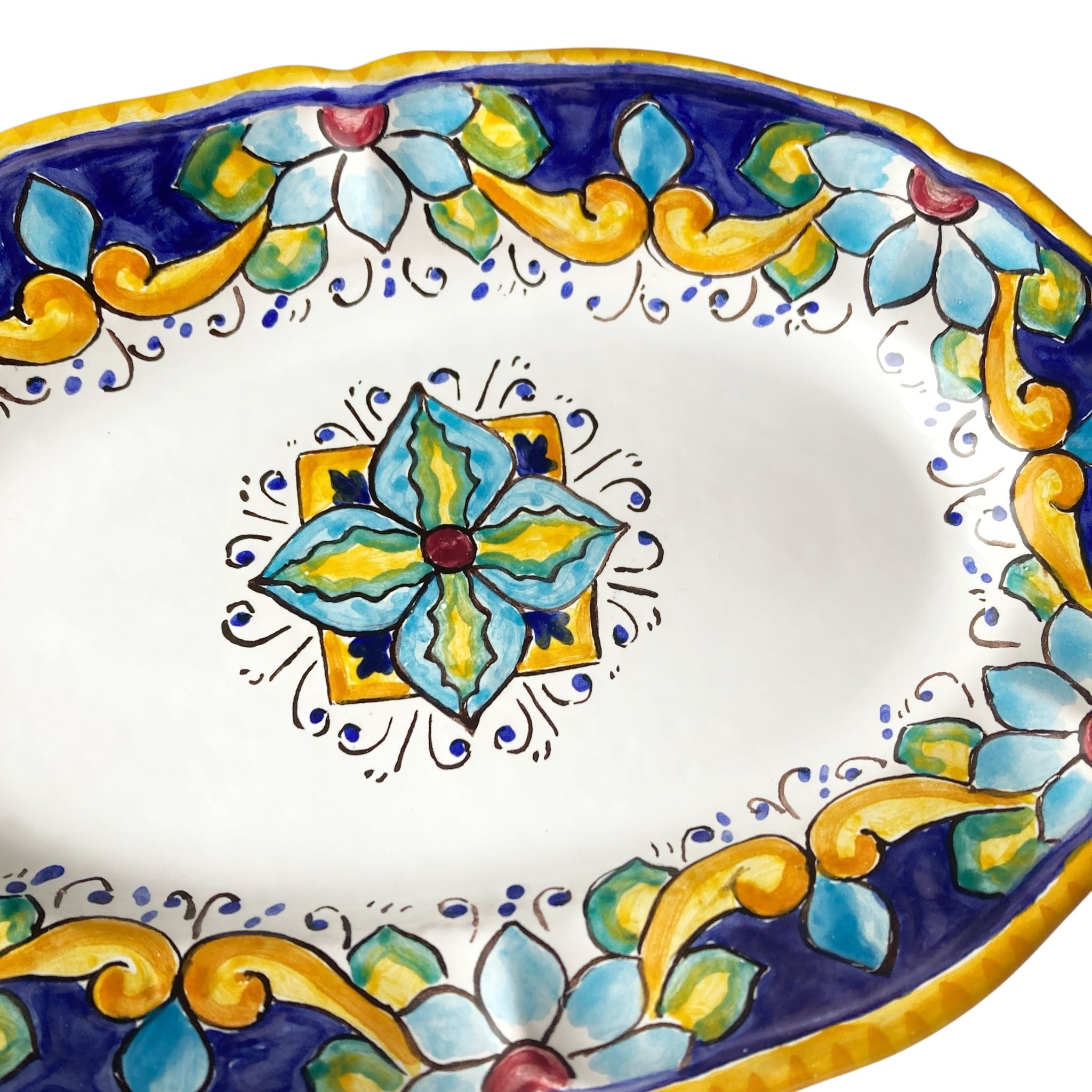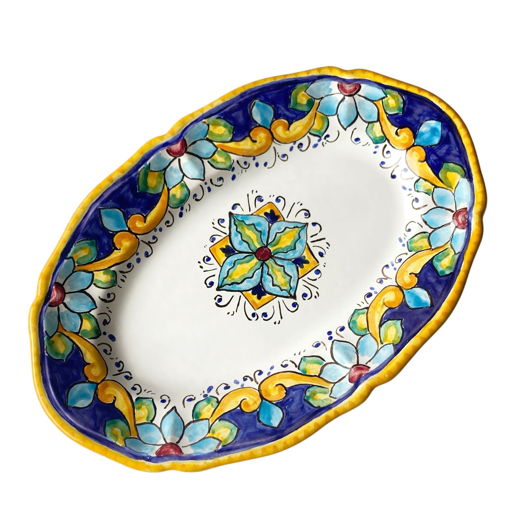 マヨリカ焼きの伝統色で描いた草花模様、エレガントなオーバル皿。