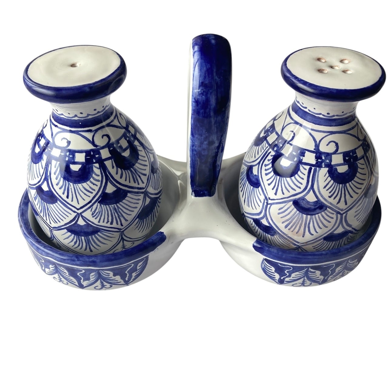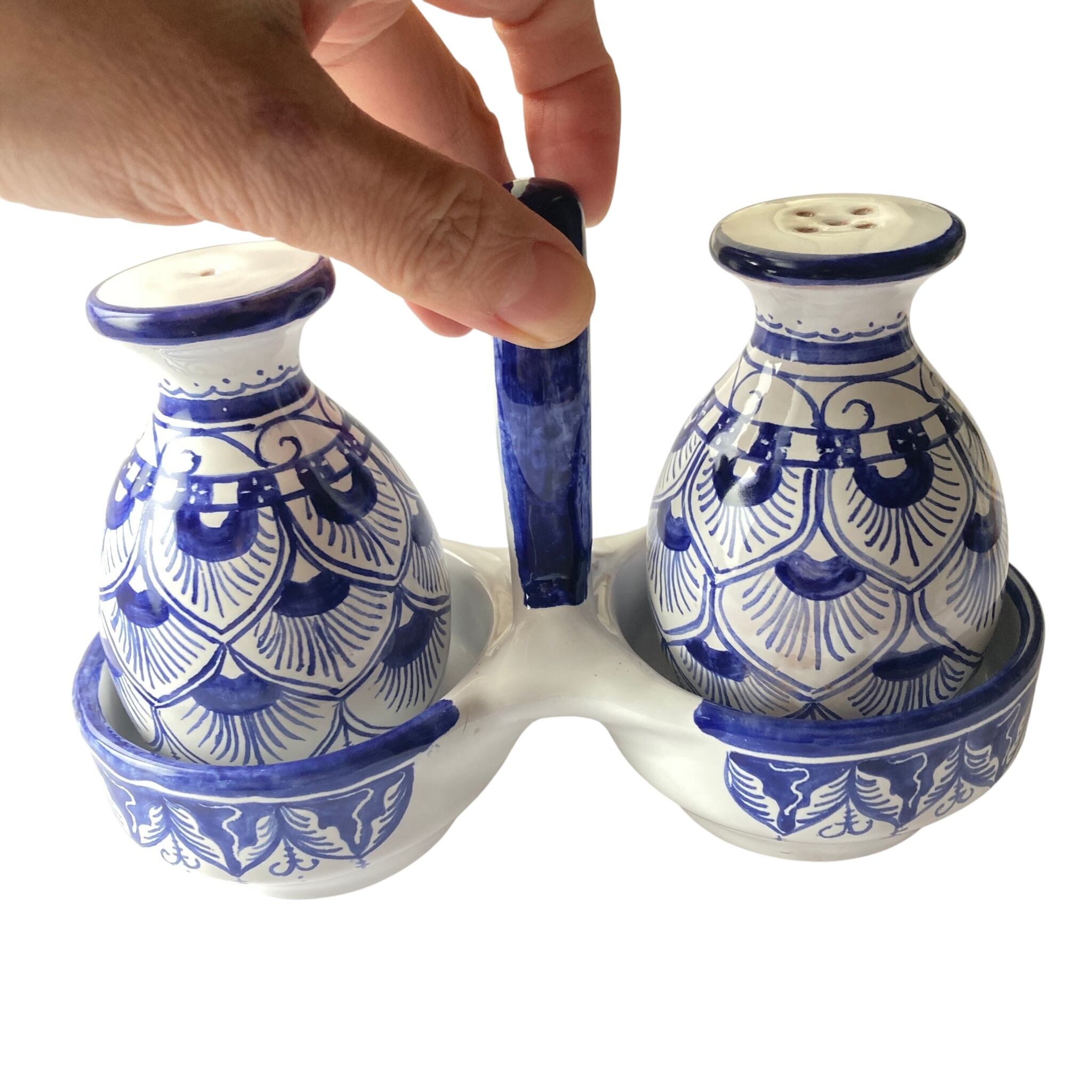コロンとした形が可愛い、陶器のホルダー付き塩コショウ入れ。