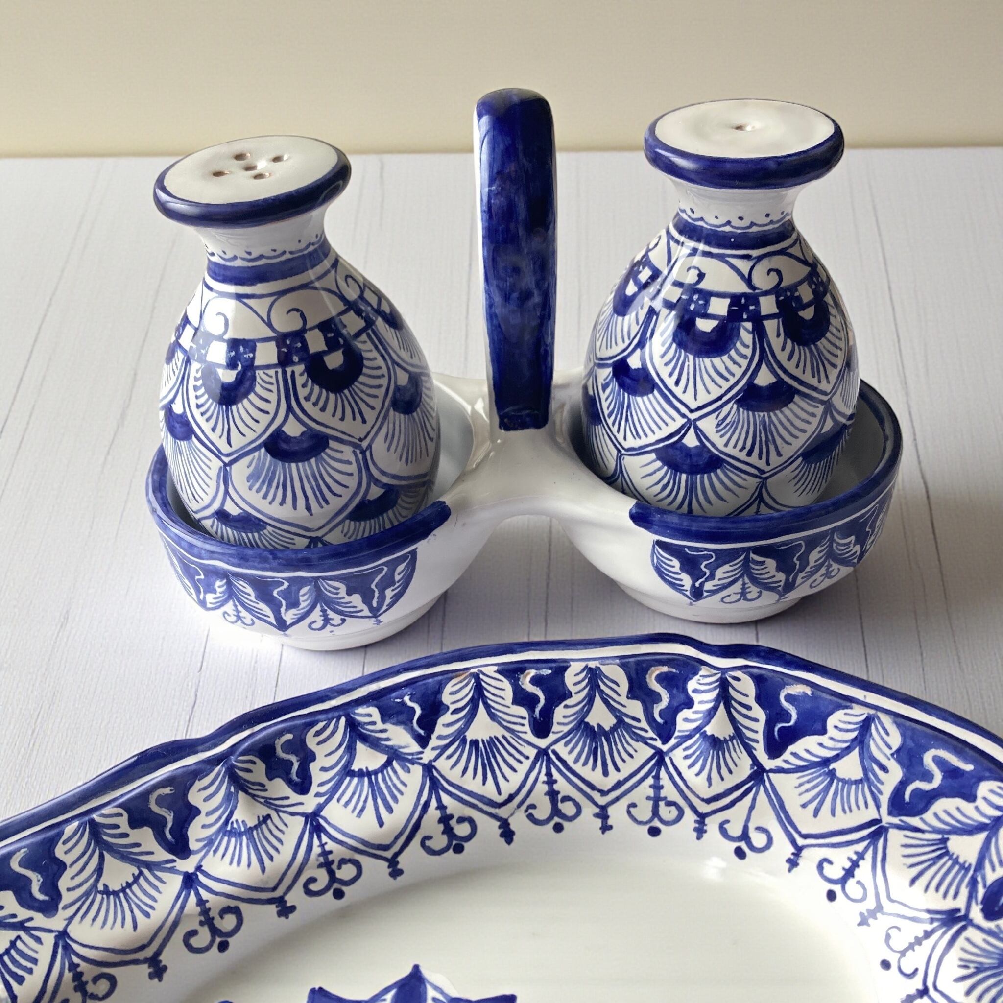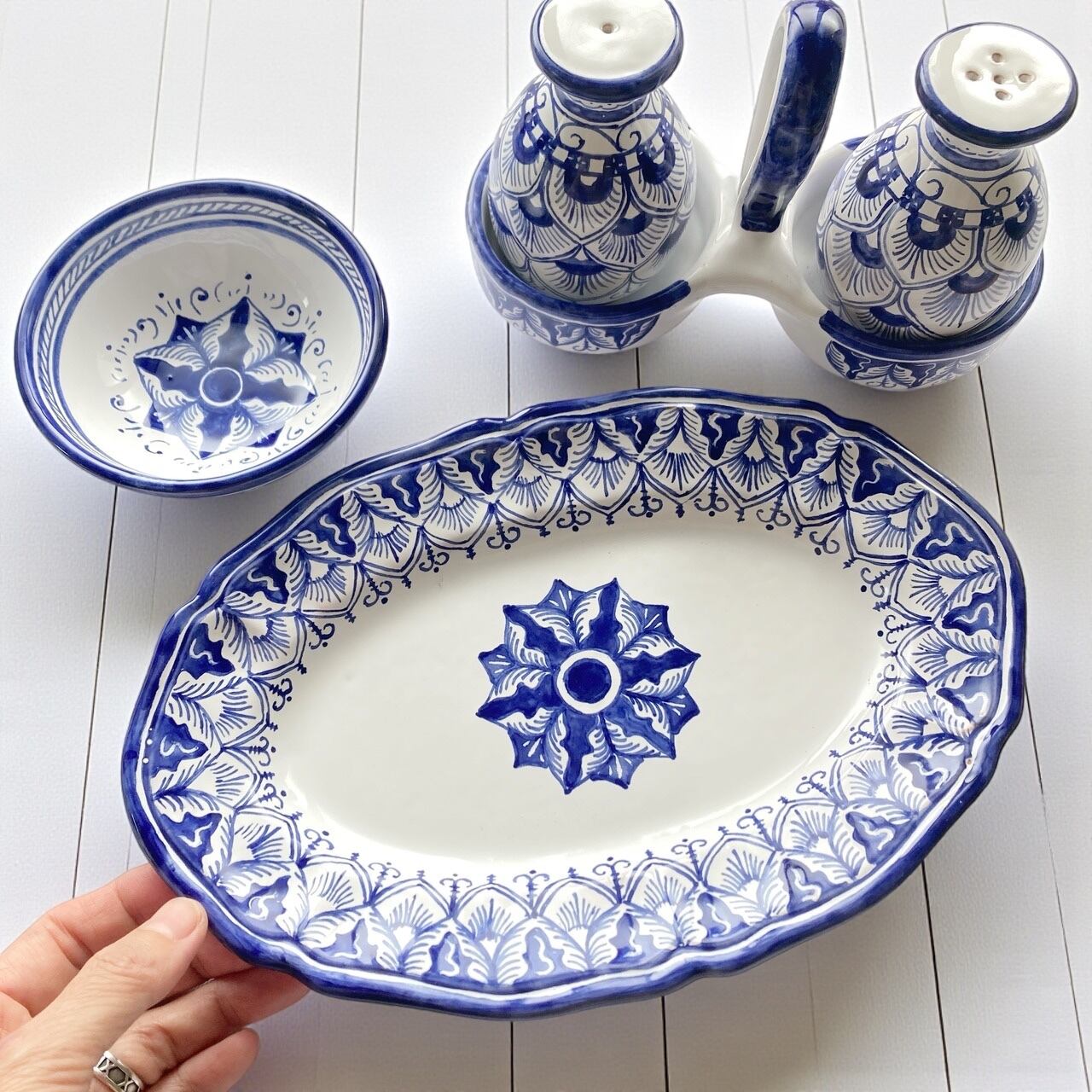 ブルー一色で描いたエレガントな幾何学模様。置いていくだけで食卓が華やかになります。