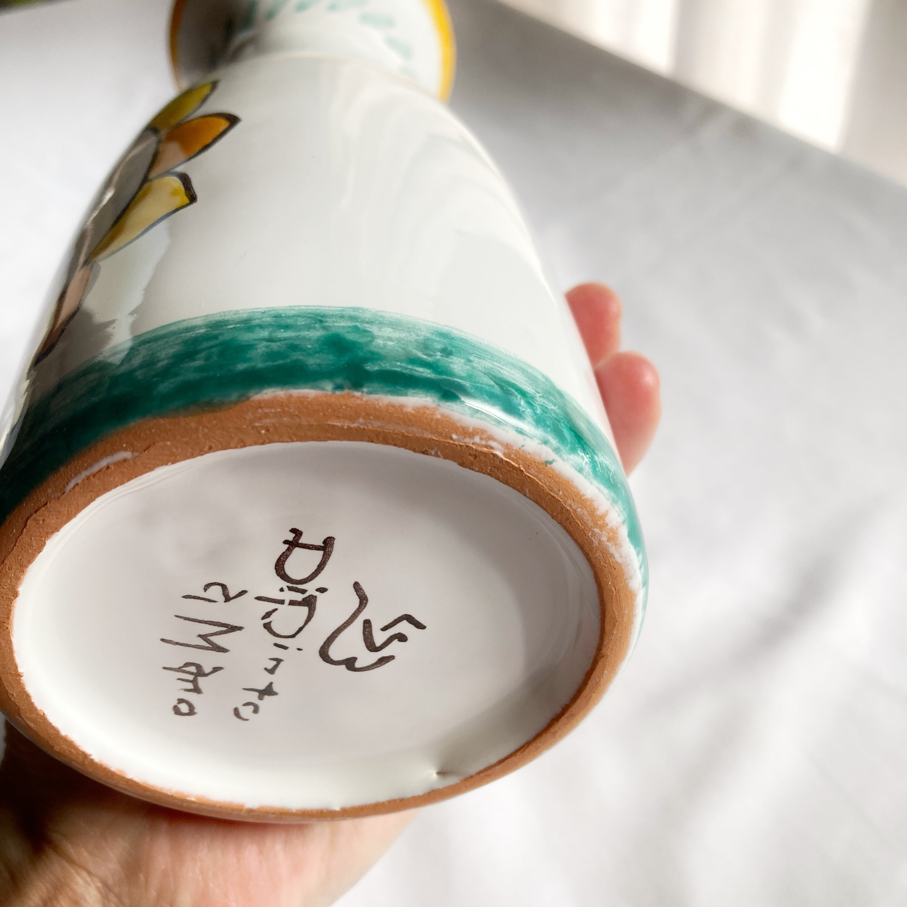 素焼きに不透明の白い釉薬を掛け、その上から手描きで絵付けし約1000度で燃焼します。