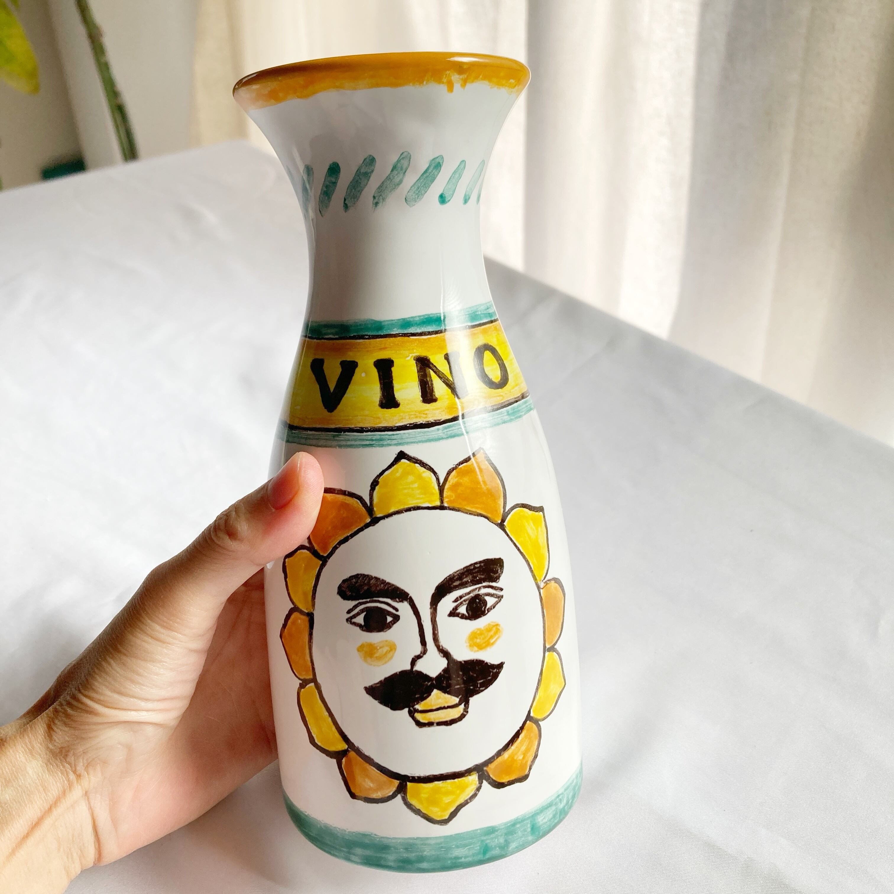 マヨリカ焼きの伝統色で描いた太陽モチーフ。 ”VINO”はイタリア語でワインの意味です。