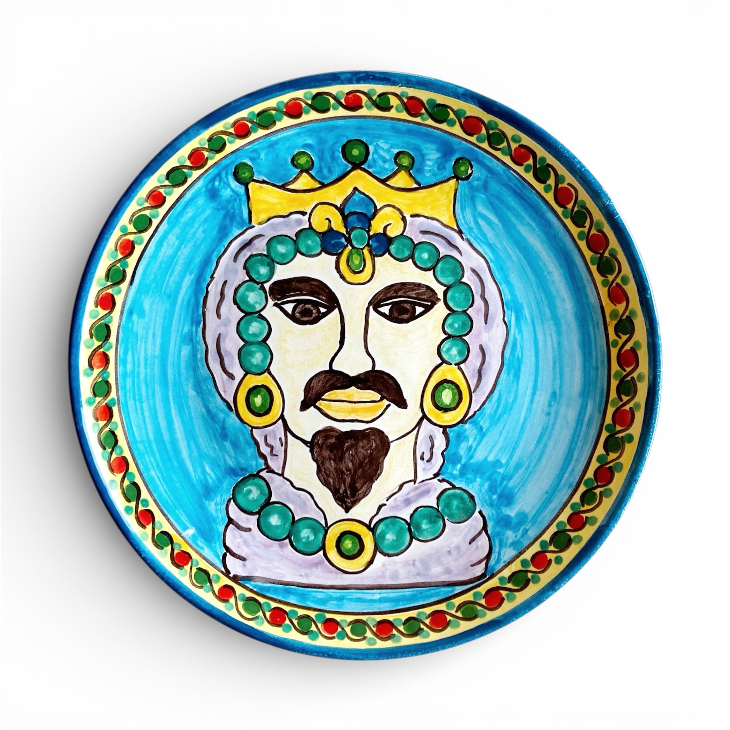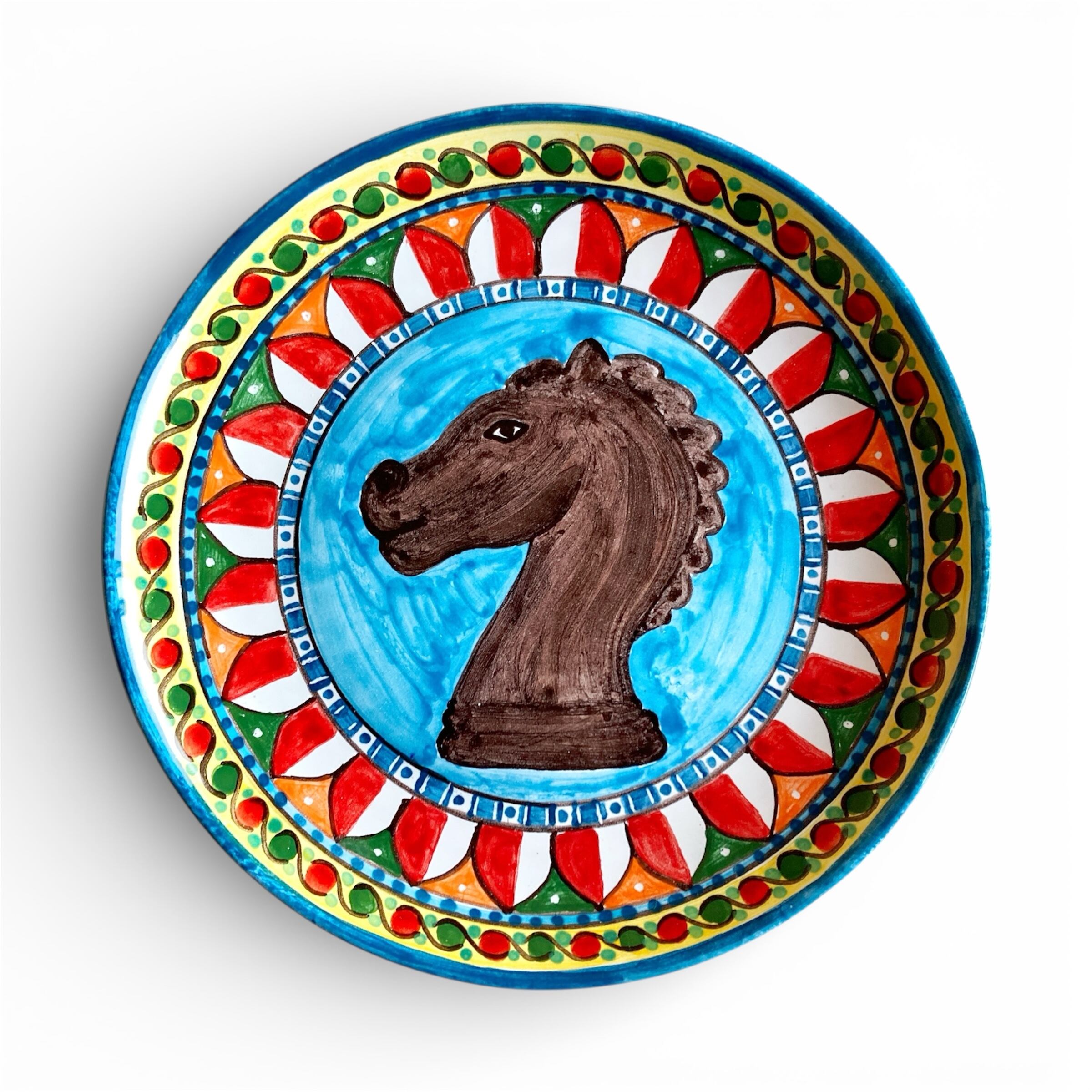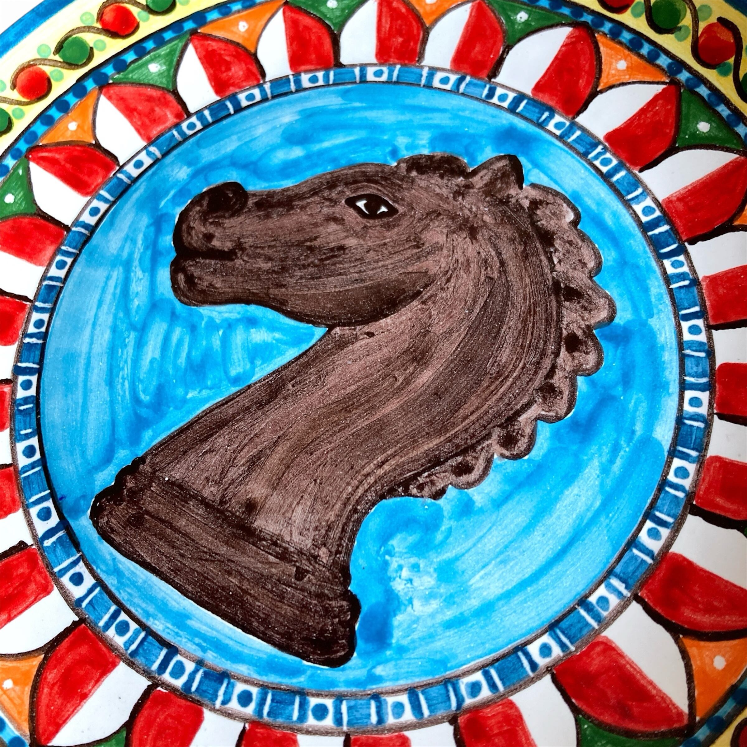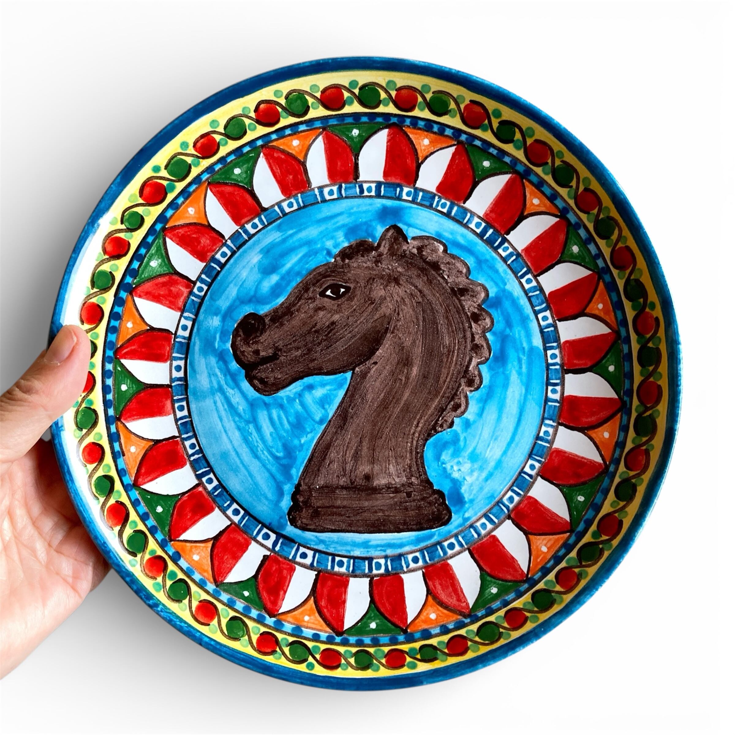 「ムーア人の頭の鉢」と「馬の置物」のモチーフ。文化の混じり合った南欧の色彩と模様で描いた、食器にもインテリアにもなるゴージャスな絵皿。