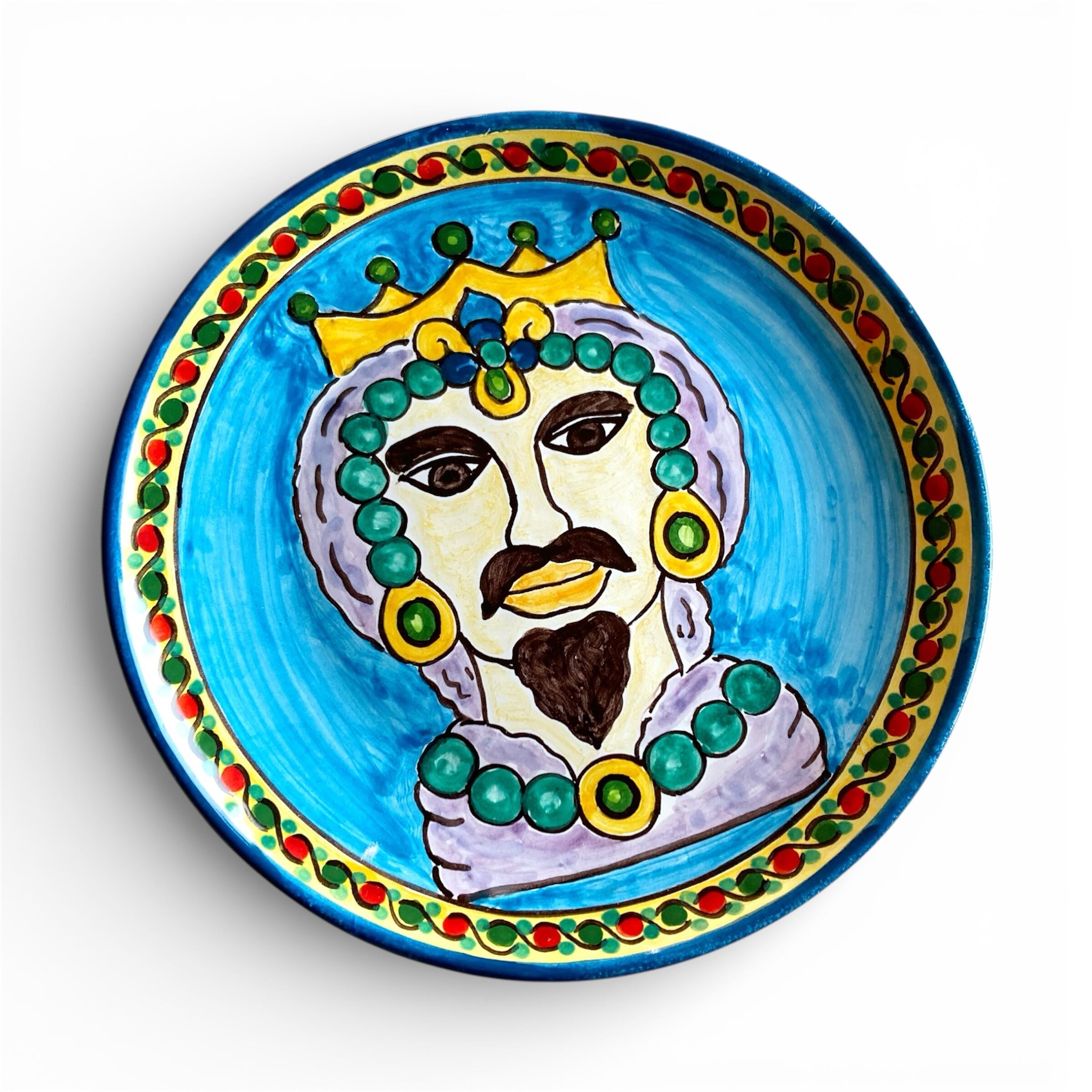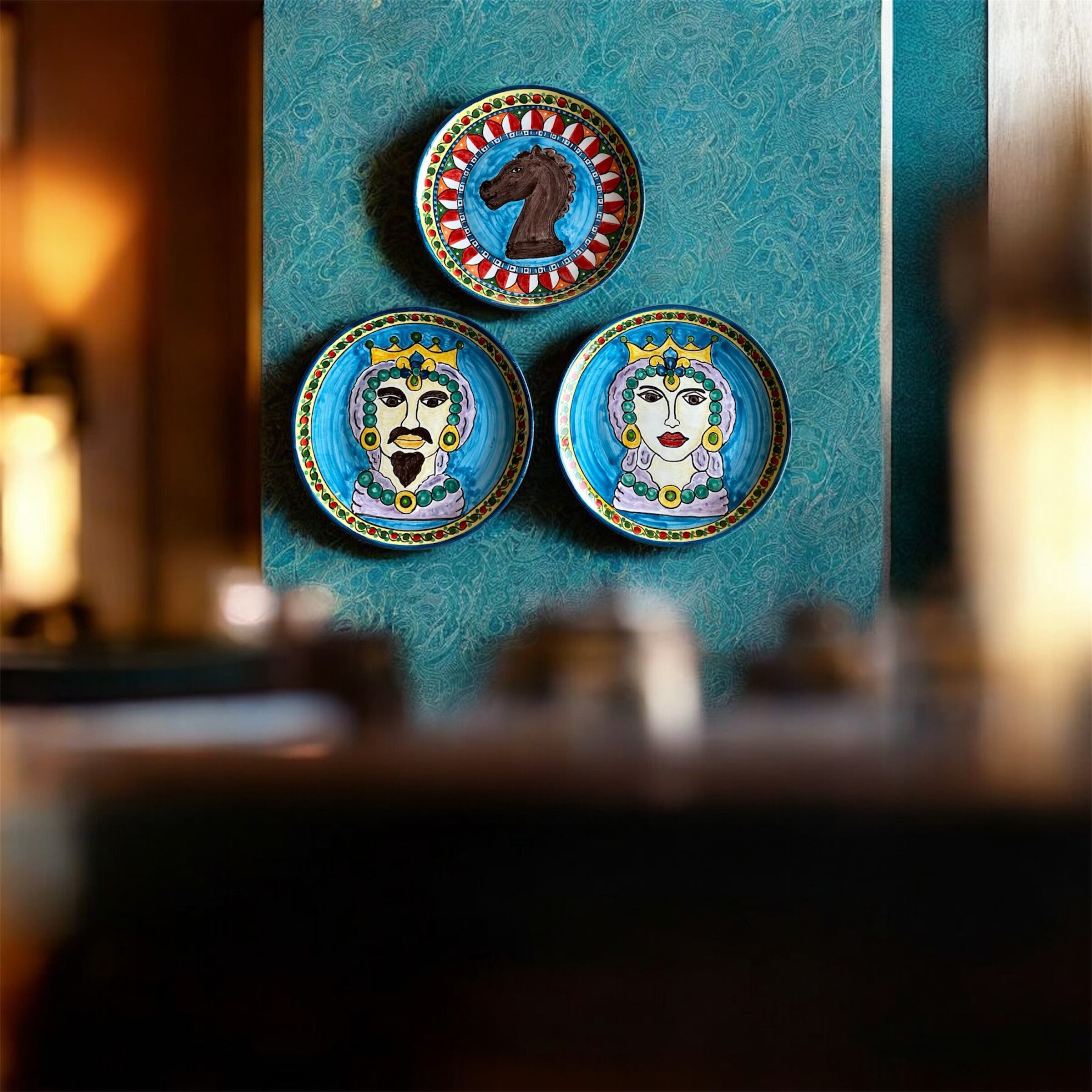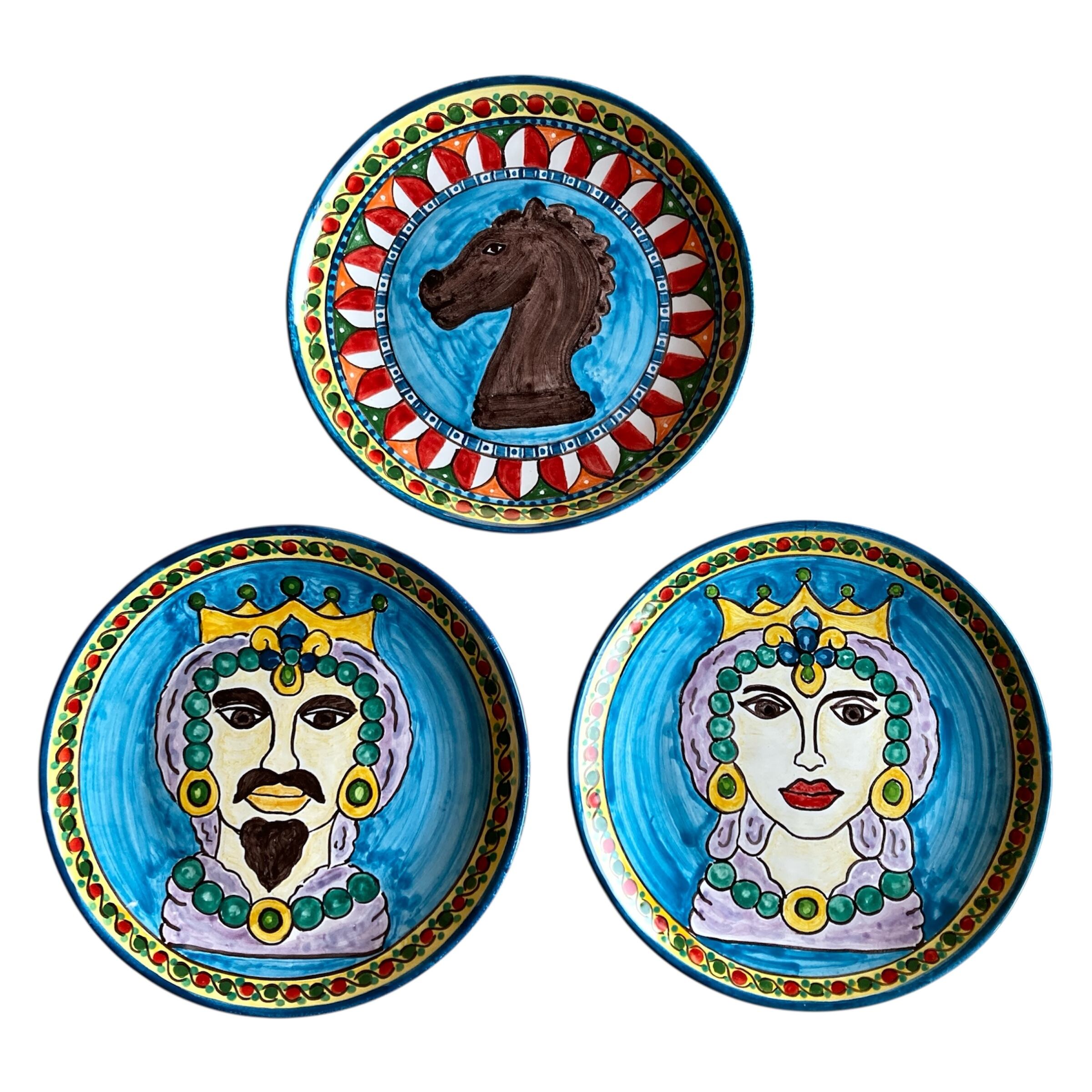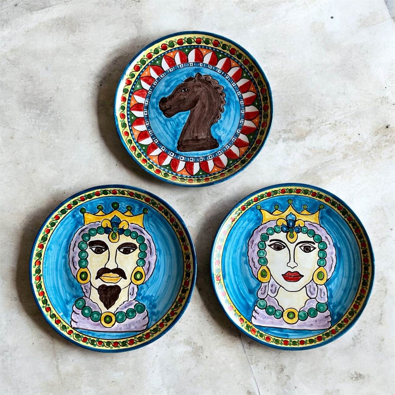 「ムーア人の頭の鉢」と「馬の置物」のモチーフ。文化の混じり合った南欧の色彩と模様で描いた、食器にもインテリアにもなるゴージャスな絵皿。