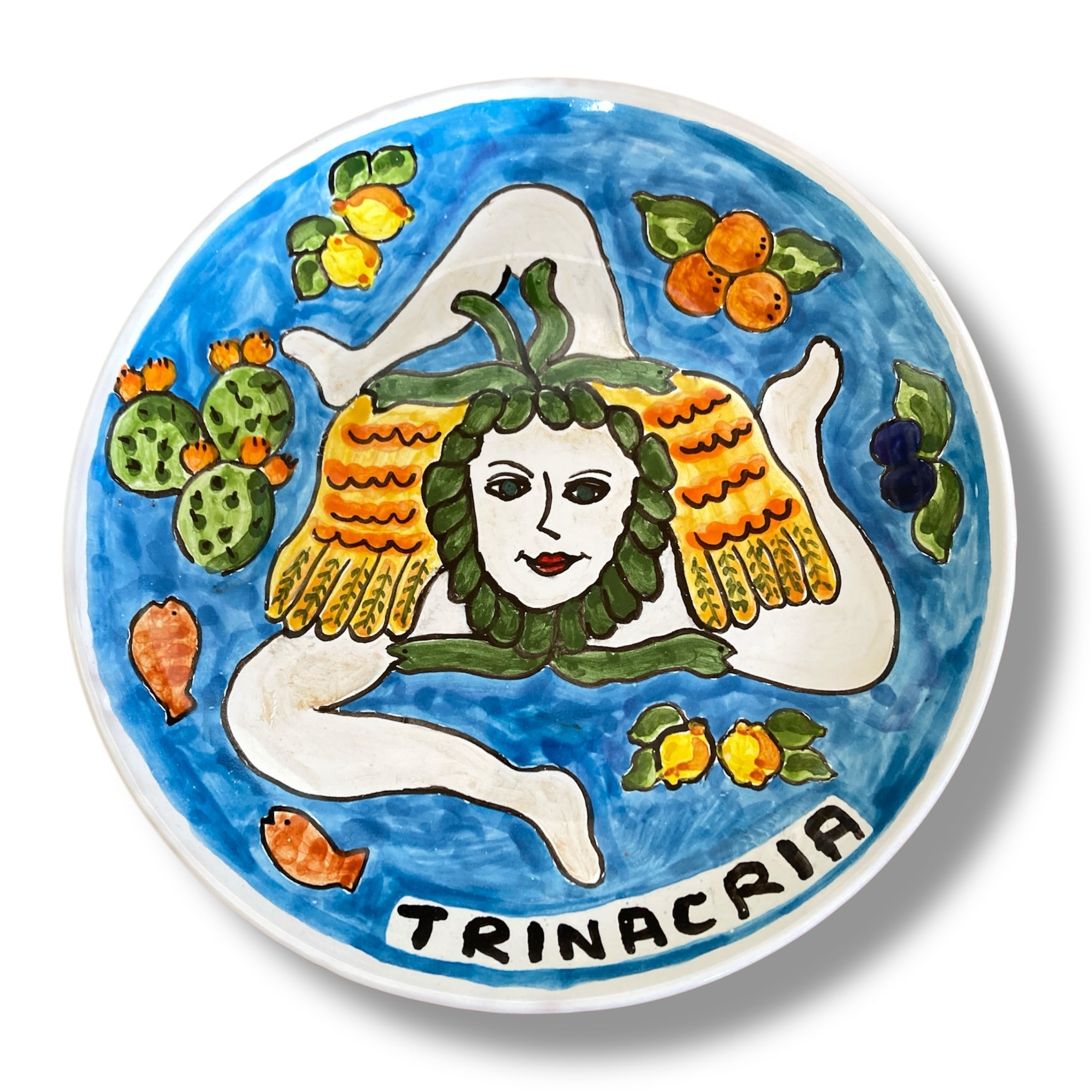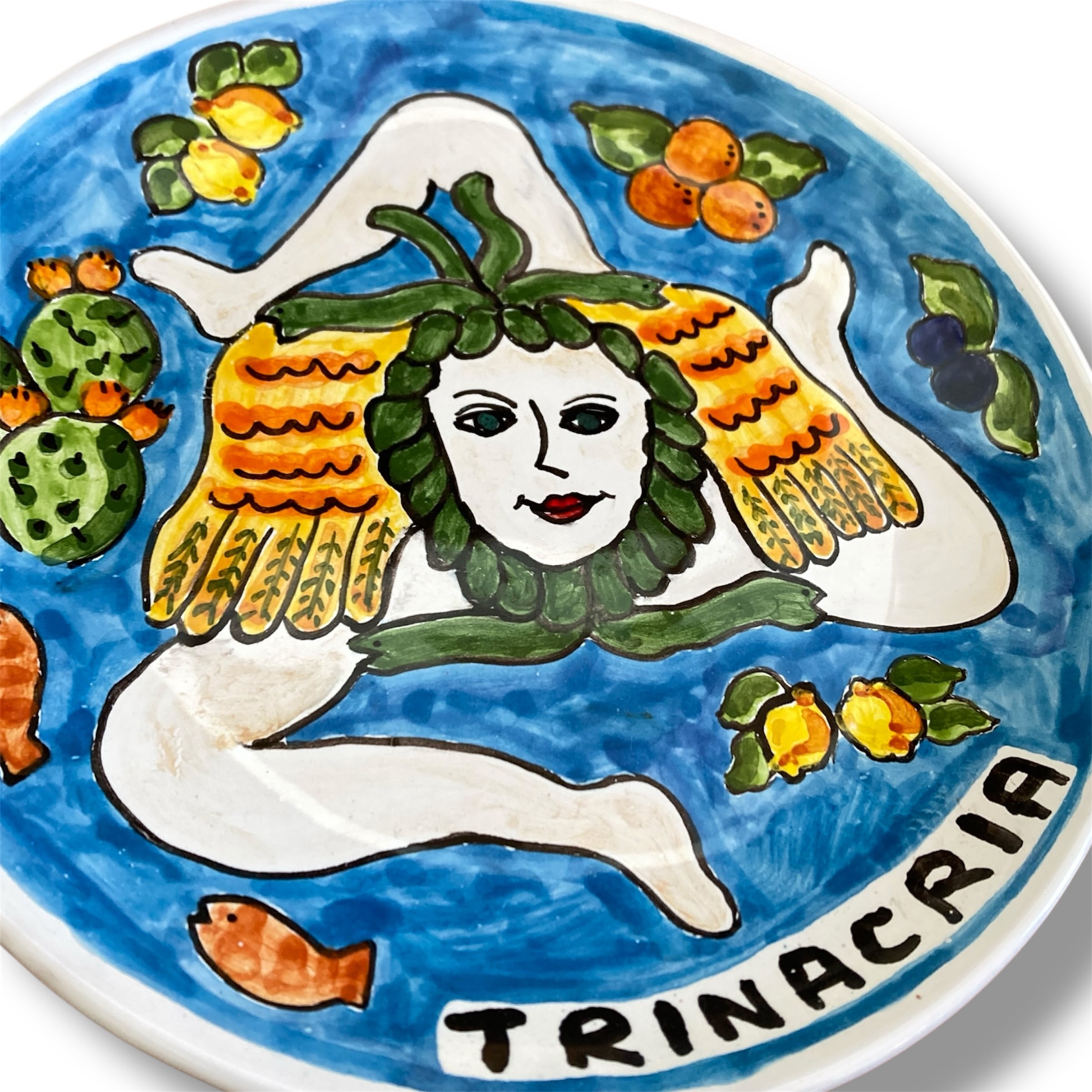 イタリアのシチリア州のシンボル、トリナクリア。シチリアの太陽、海やフルーツなどイメージながら鮮やかで明るい色彩のお皿を描きました。