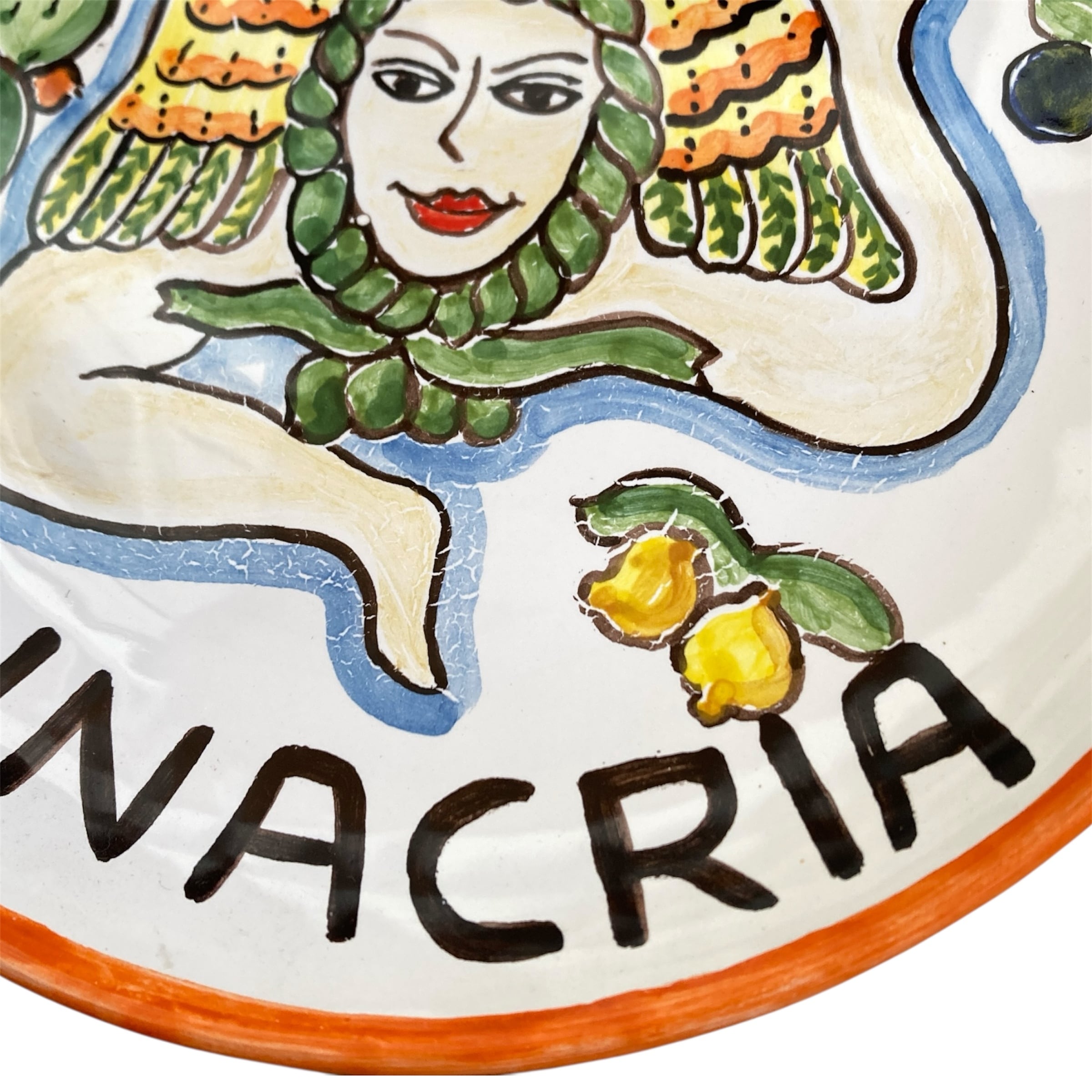 イタリアのシチリア州のシンボル、トリナクリア。シチリアの太陽、海やフルーツなどイメージながら鮮やかで明るい色彩のお皿を描きました。