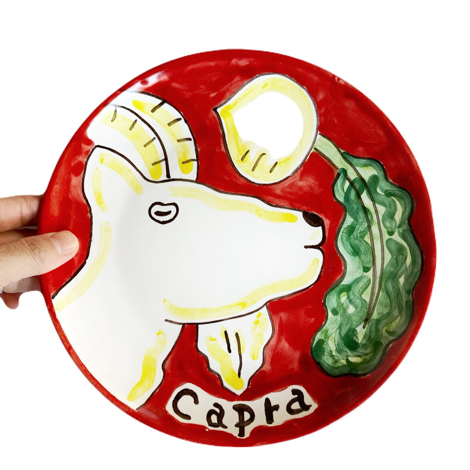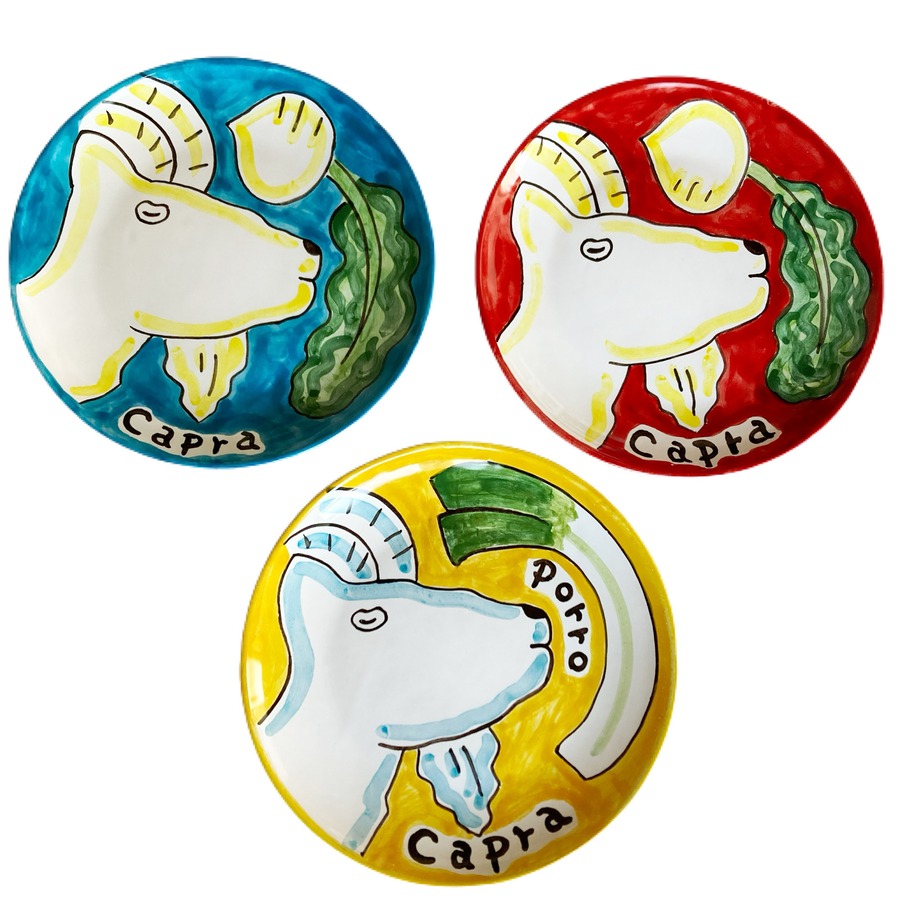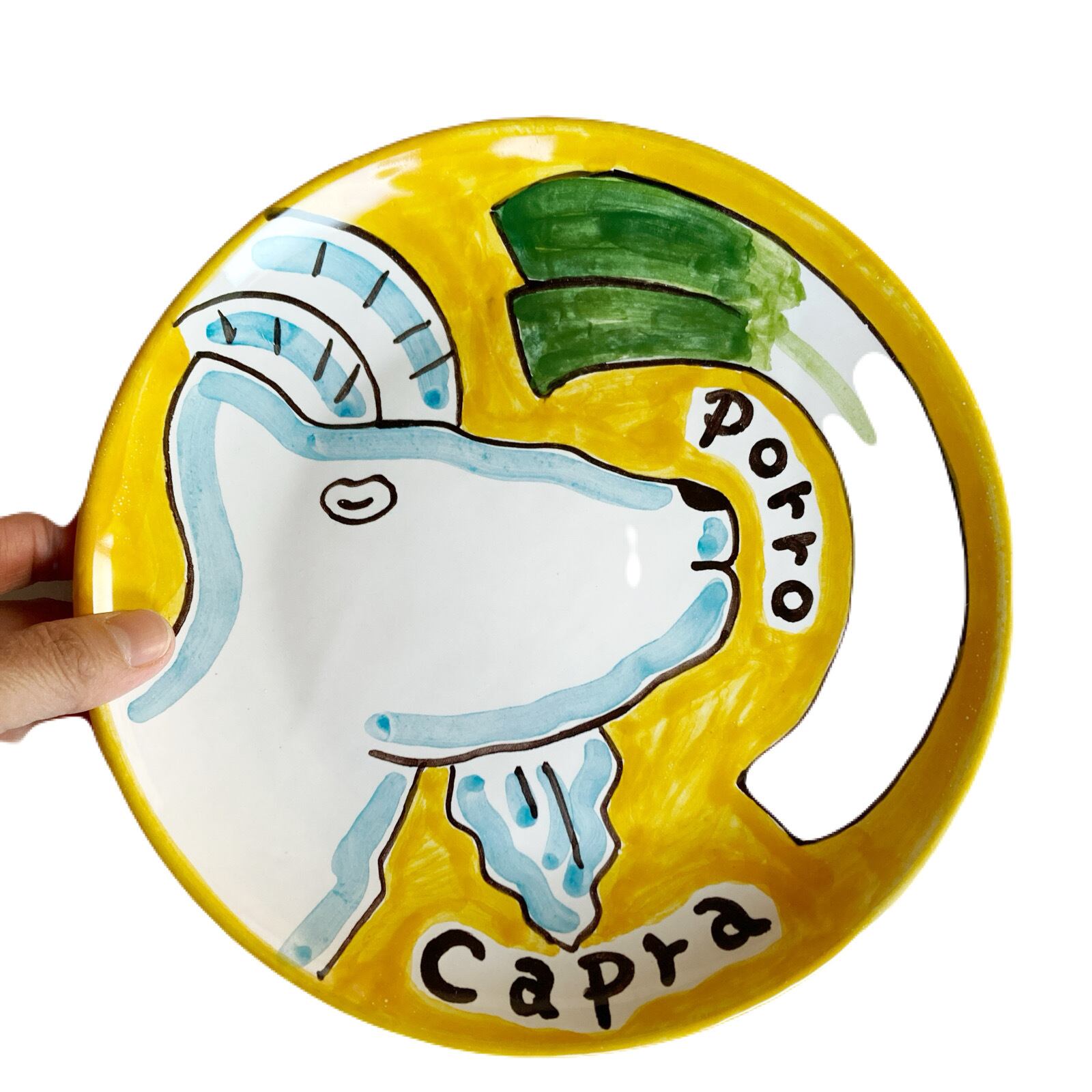 ヤギと野菜を描いた鮮やかな色彩のプレート。 取り皿やデザート皿にちょうど良い大きさ。