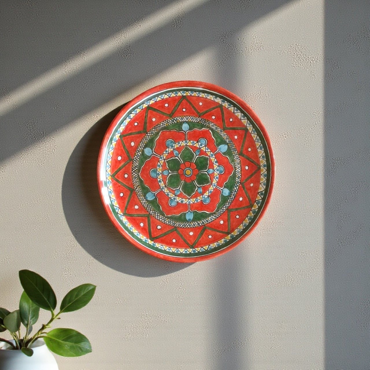 赤と緑の鮮やかな色彩の幾何学模様の絵皿です。線も一本一本手描きでじっくり時間をかけて制作しました。