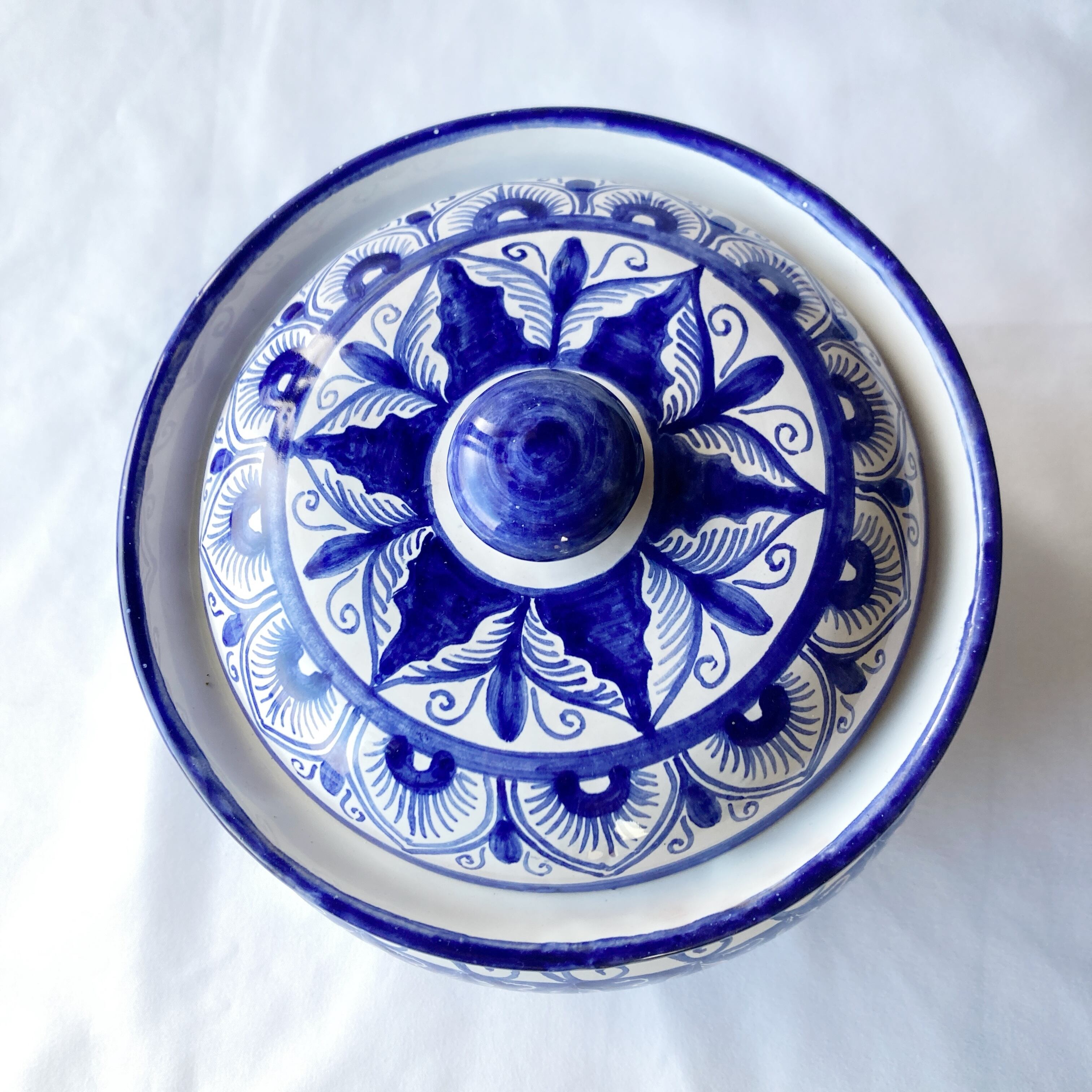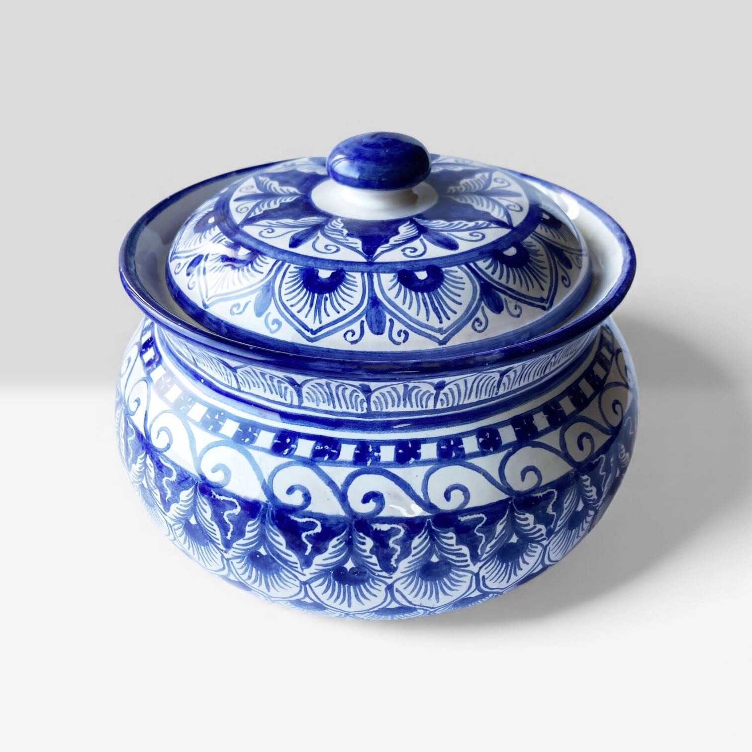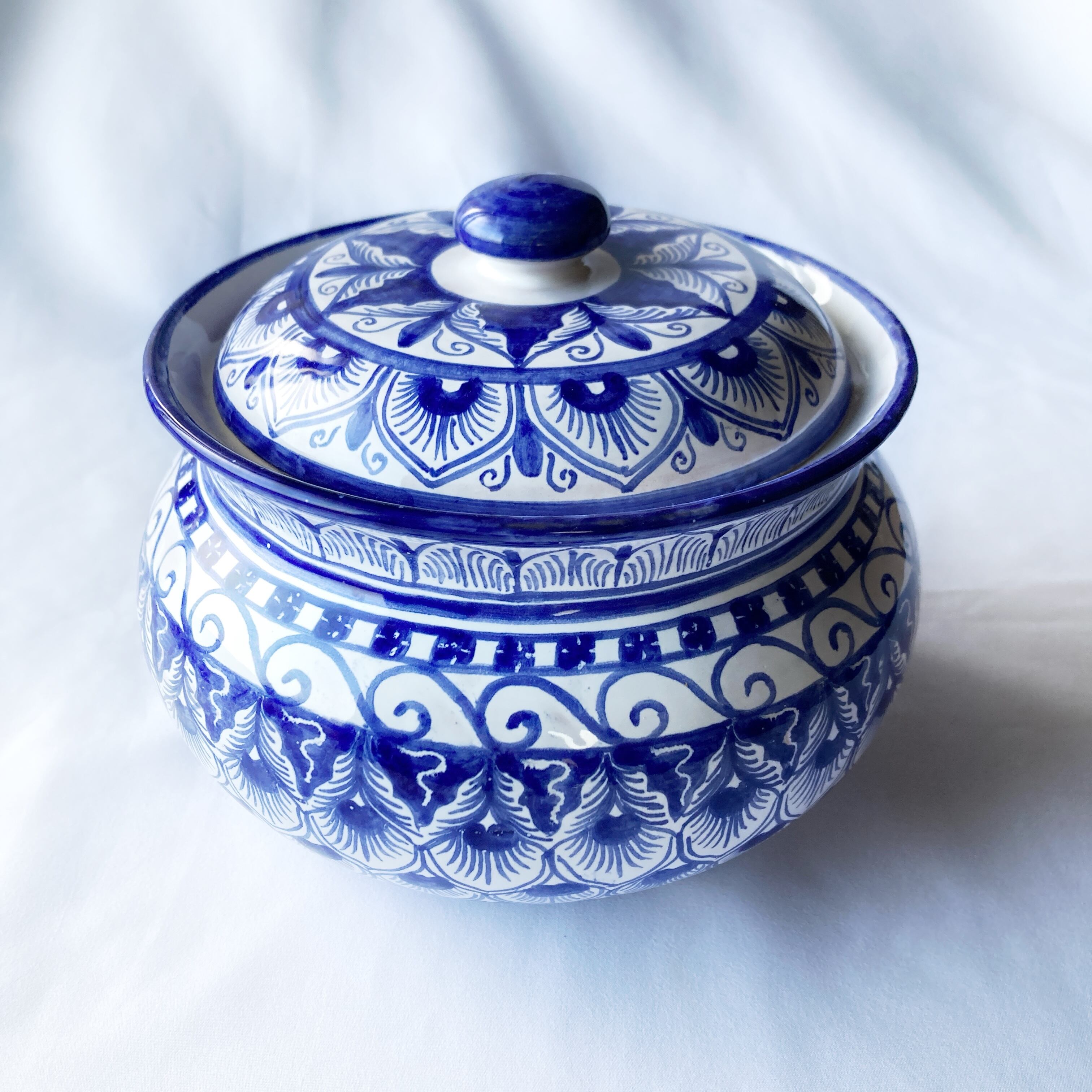 青一色で時間をかけ絵付けしました。アンティークのようなエレガントさを感じられるデザインですが、どこか温かみを感じられる蓋付き陶器。