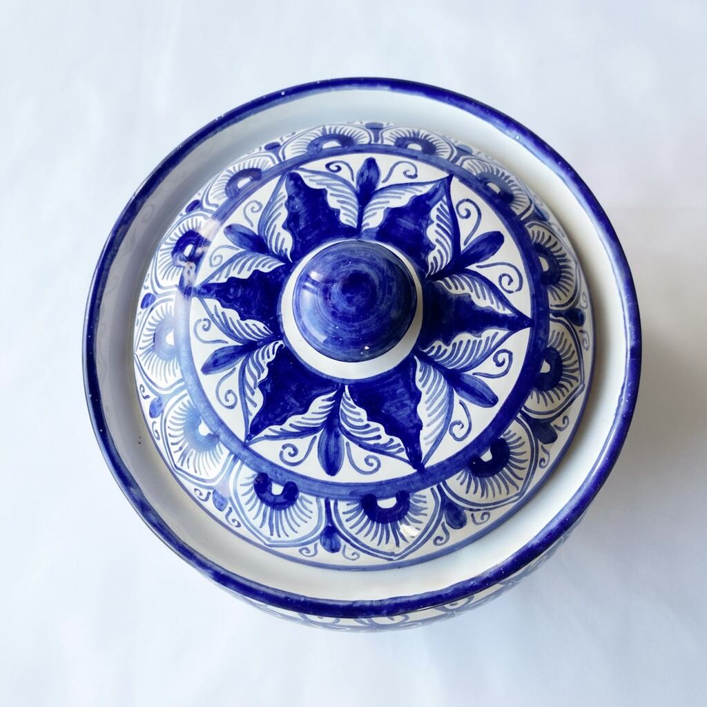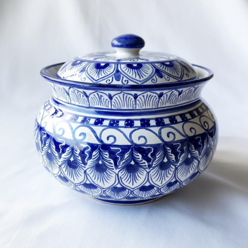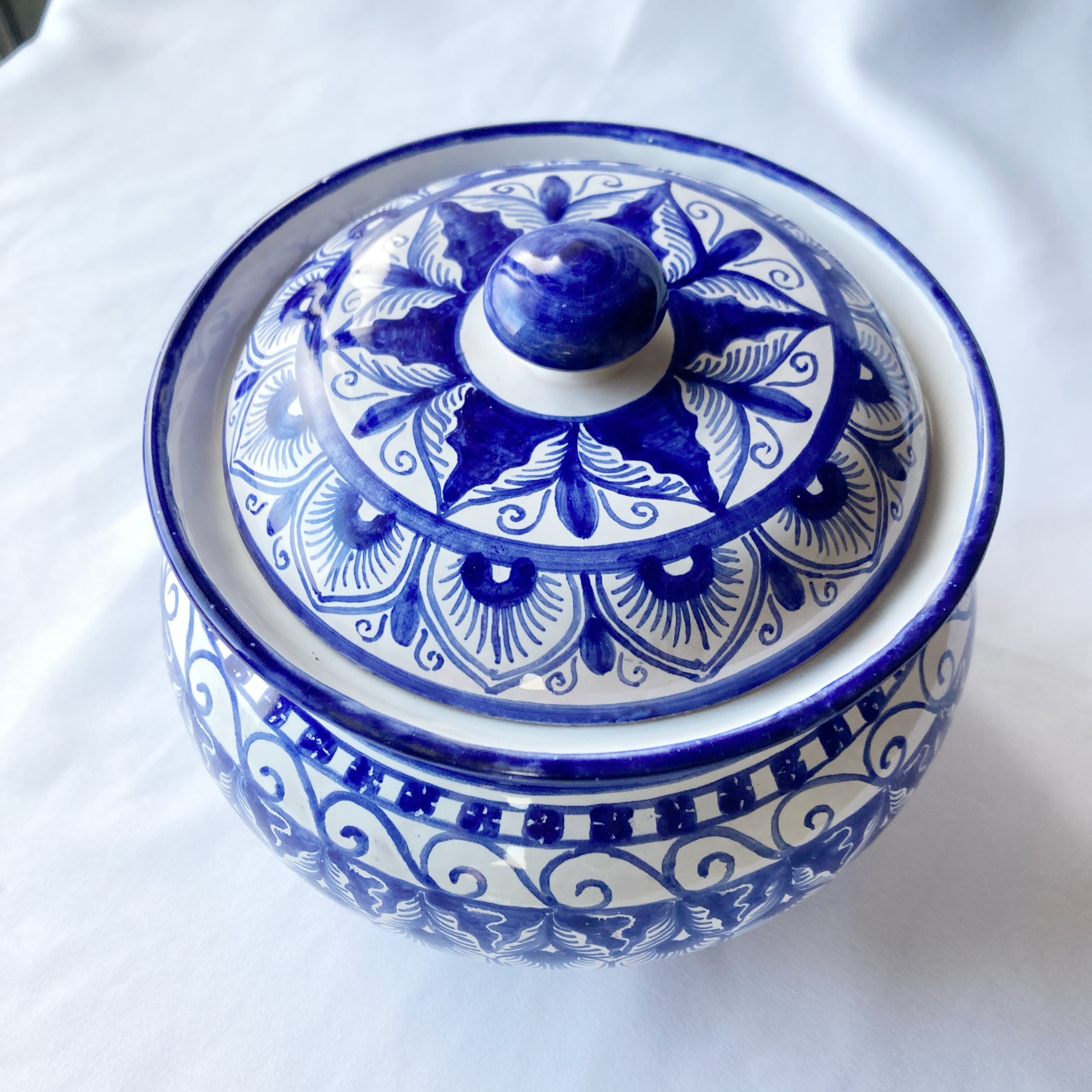 青一色で時間をかけ絵付けしました。アンティークのようなエレガントさを感じられるデザインですが、どこか温かみを感じられる蓋付き陶器。