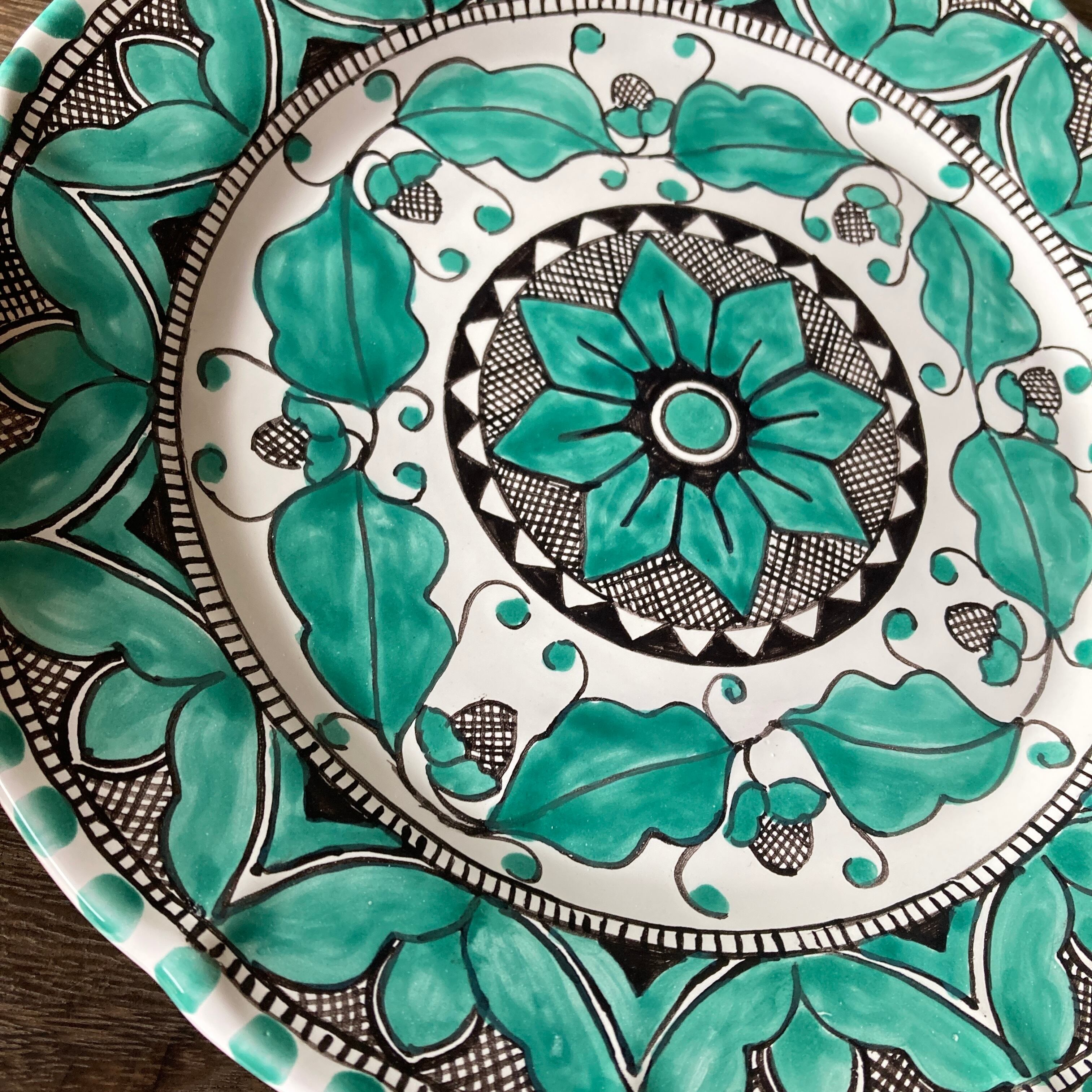 エメラルドグリーンの幾何学模様、アンティーク調のデザインでインテリアにもなるお皿です。